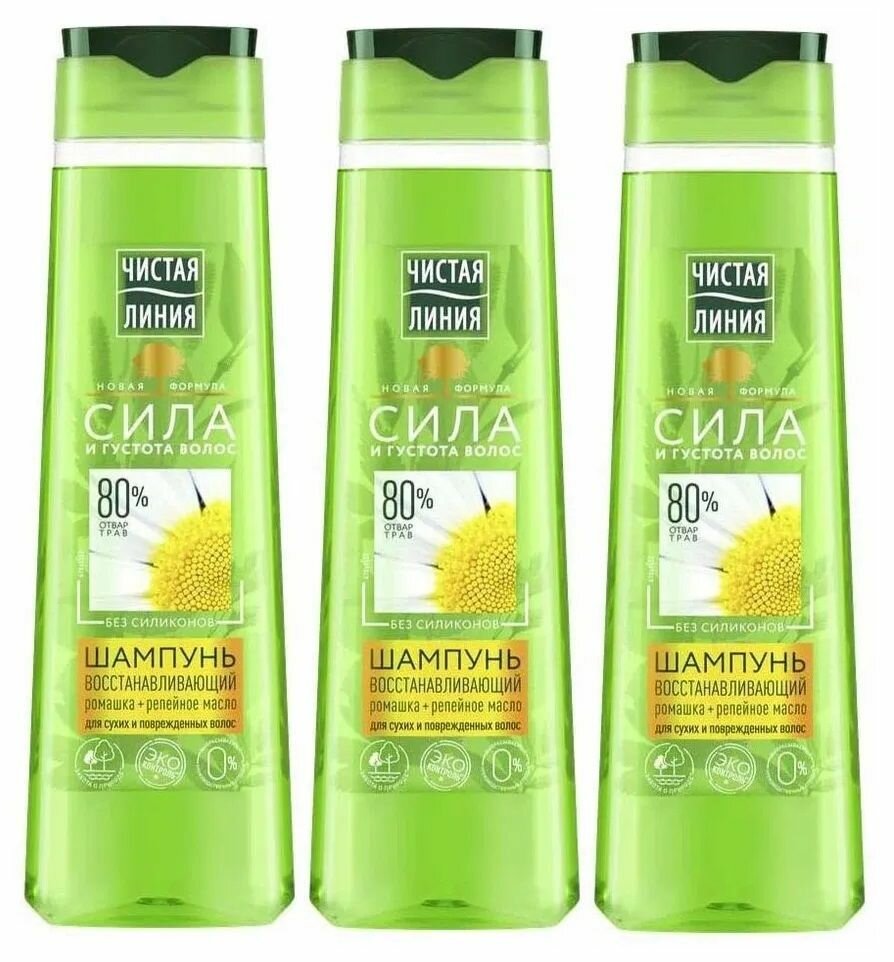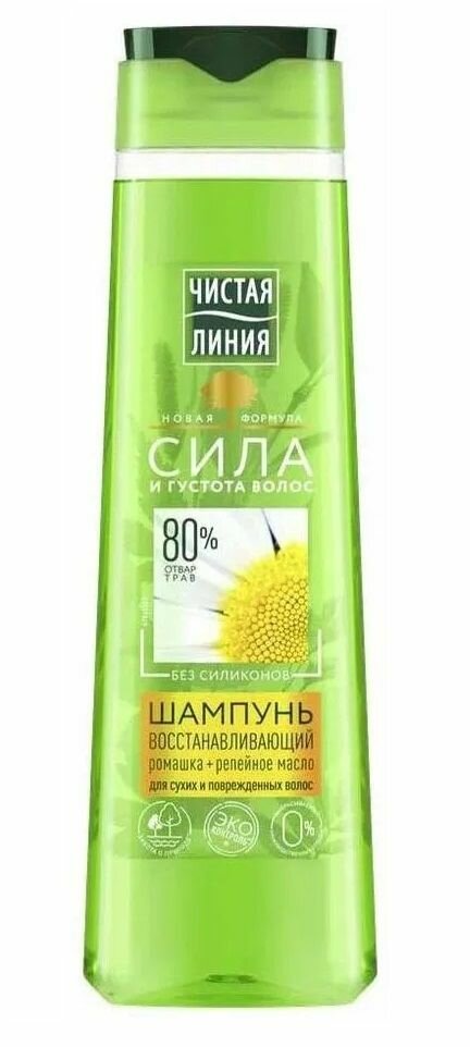 Шампунь Чистая линия Восстанавливающий Ромашка для сухих и поврежденных волос, созданный на основе новой формулы с добавлением репейного масла и экстракта ромашки, обеспечивает комплексный уход за кожей головы и волосами. Репейное масло проникает глубоко в волосы, восстанавливая их по всей длине, а экстракт ромашки придает блеск и мягкость. Регулярное применение шампуня и бальзама заменяет курс восстановления волос репейным маслом.