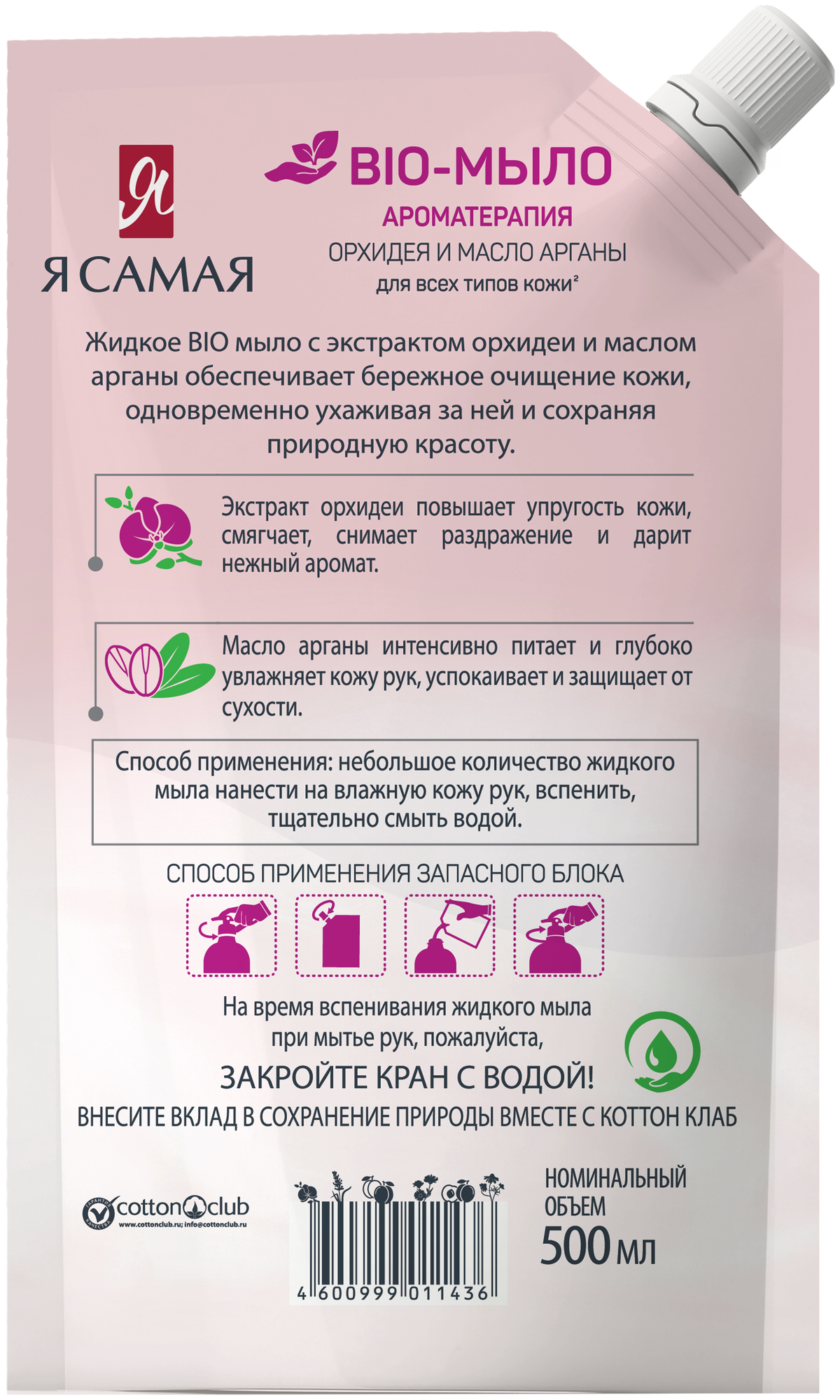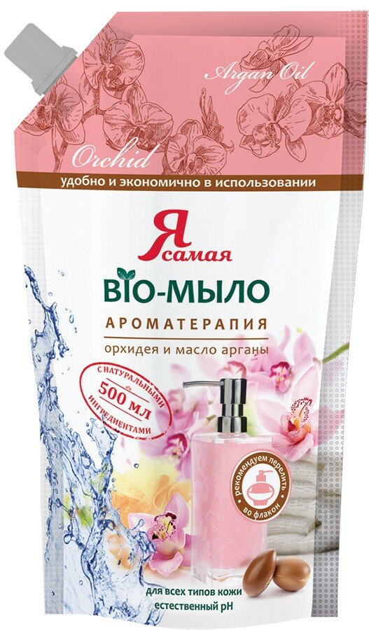 Жидкое BIO-мыло Я самая "Масло арганы и орхидея" обеспечит бережное очищение и уход за красотой и здоровьем кожи рук. Масло арганы интенсивно питает и увлажняет кожу, экстракт орхидеи повышает упругость кожи, смягчает ее и снимает раздражение. Нежный аромат будет дарить романтичное настроение каждый день.