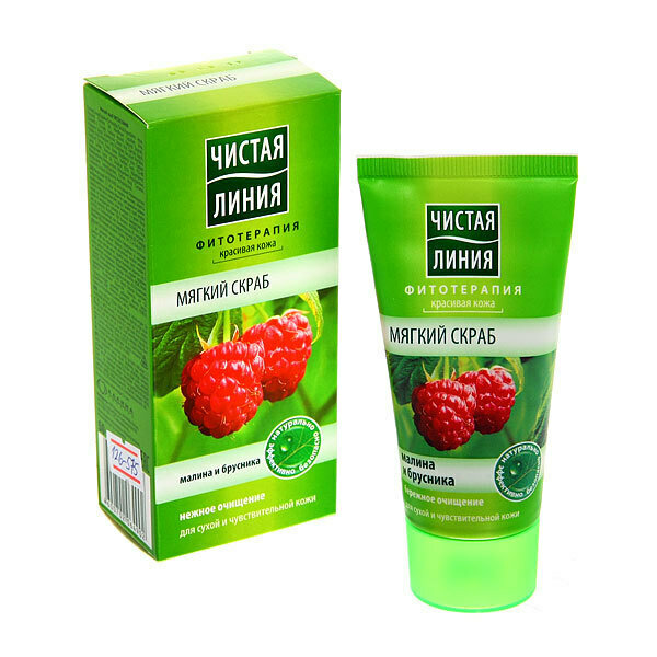 Подари коже гладкость и нежность! Мягкий скраб для лица Чистая линия Малина и клюква содержит: сок малины, который успокаивает кожу, помогая предотвращать покраснение и раздражение, смягчает и увлажняет ее; косточки клюквы, мягкие очищающие частицы которых бережно удаляют ороговевшие клетки, не травмируя чувствительную кожу, улучшают цвет лица, повышают тонус кожи.