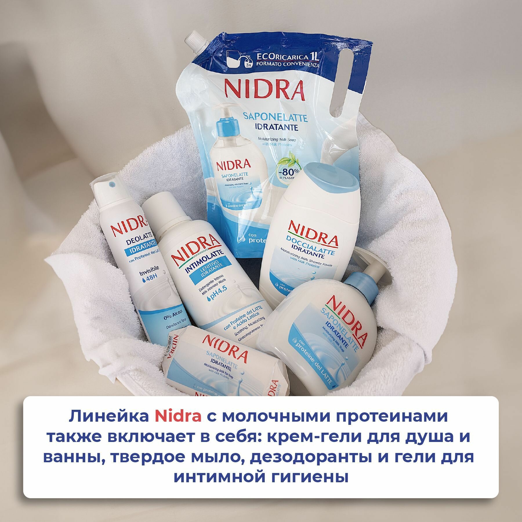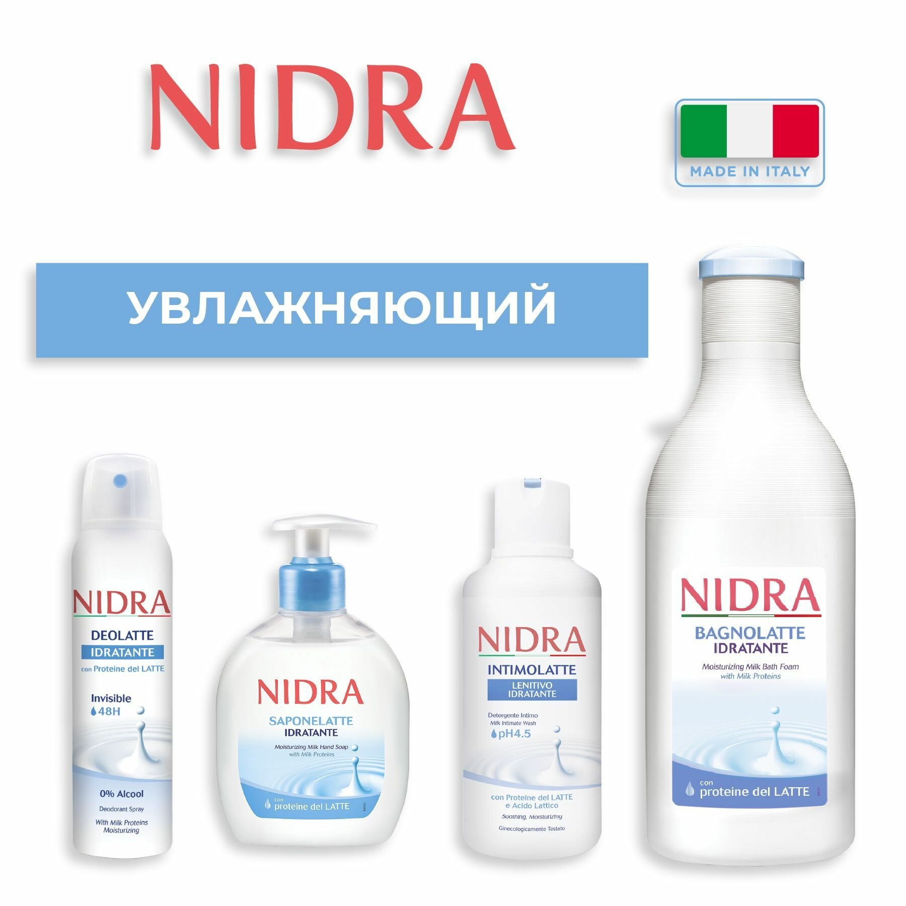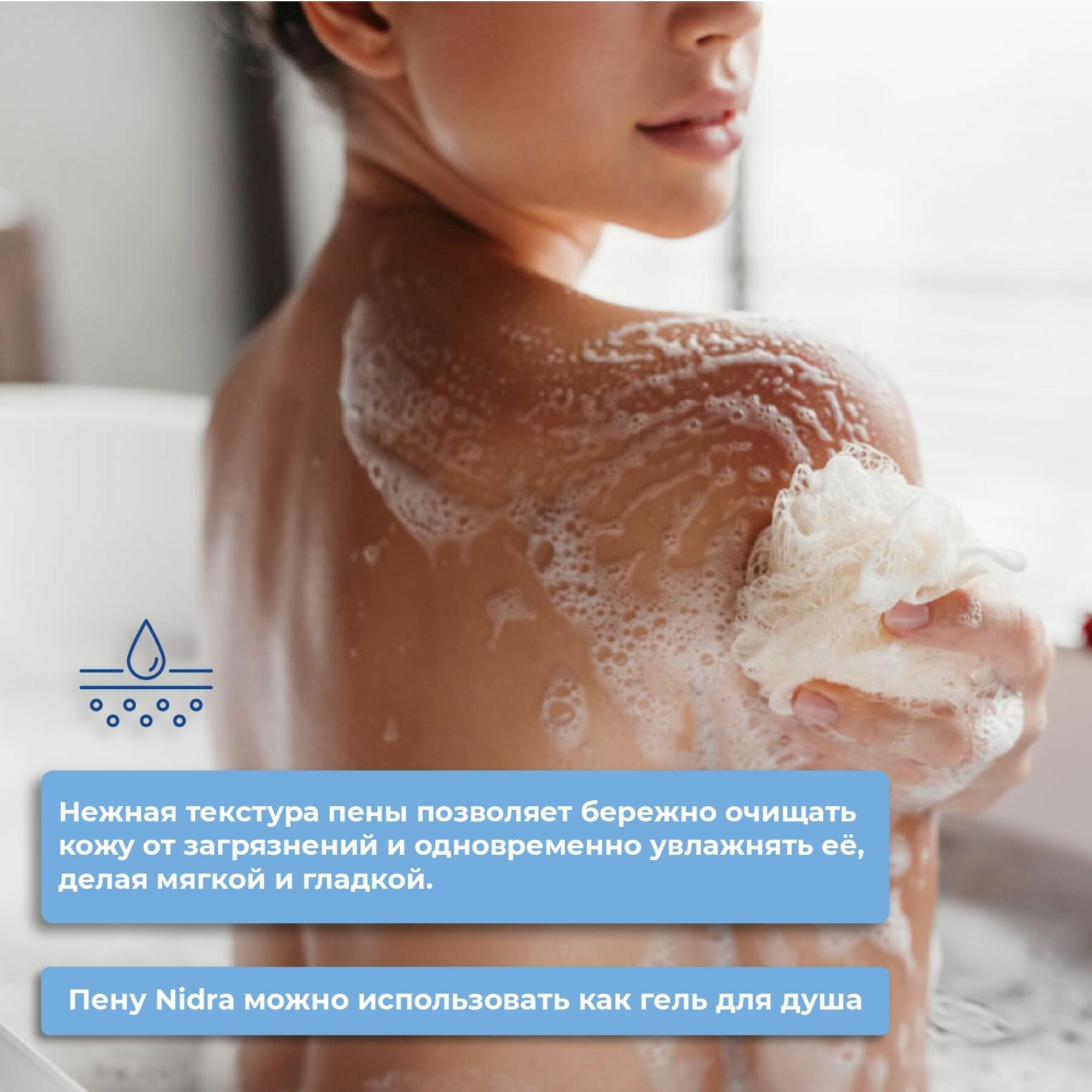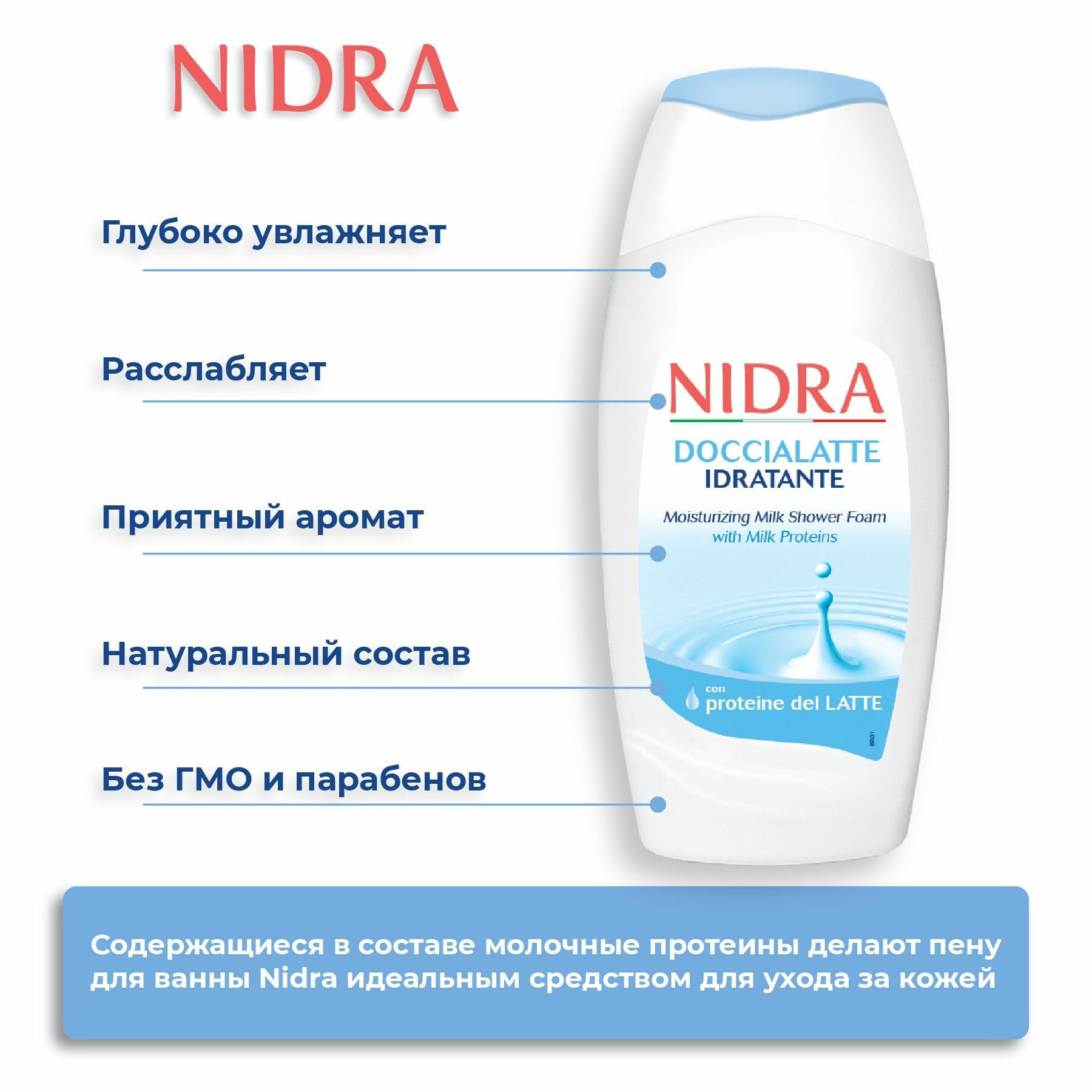 Пена-молочко для душа Nidra Увлажняющая с молочными протеинами обогащена 100% натуральными протеинами молока, которые деликатно очищают и увлажняют кожу. Подходит для всех типов кожи, в том числе детской.