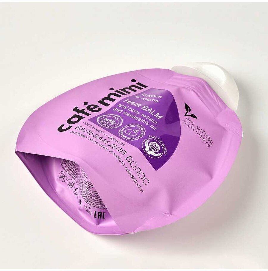 Бальзам для волос Cafemimi "Питание и объем" с экстрактом ягод асаи и маслом макадамии 100мл. Питательный бальзам с маслом макадамии и экстрактом ягод асаи насыщает волосы жизненной силой, восстанавливает, делает более послушными, придает объем.