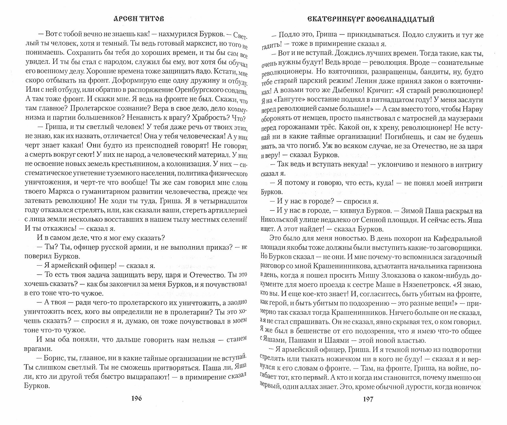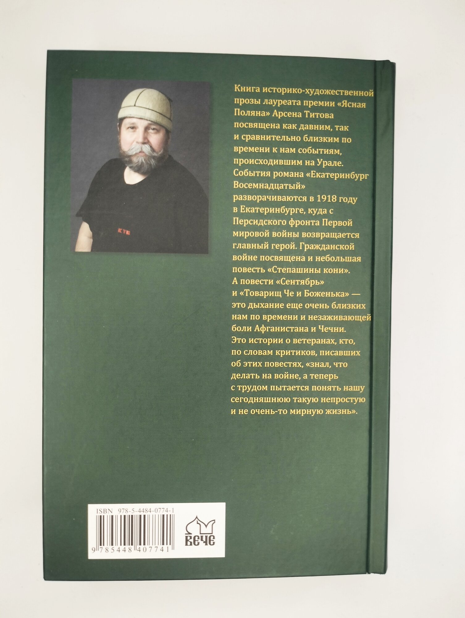 Книга историко-художественной прозы лауреата премии "Ясная Поляна" Арсена Титова посвящена как давним, так и сравнительно близким по времени к нам событиям, происходившим на Урале. События романа "Екатеринбург Восемнадцатый" разворачиваются в 1918 году в Екатеринбурге, куда с Персидского фронта Первой мировой войны возвращается главный герой. Гражданской войне посвящена и небольшая повесть "Степашины кони". А повести "Сентябрь" и "Товарищ Че и Боженька" - это дыхание еще очень близких нам по времени и незаживающей боли Афганистана и Чечни. Это истории о ветеранах, кто, по словам критиков, писавших об этих повестях, "знал, что делать на войне, а теперь с трудом пытается понять нашу сегодняшнюю такую непростую и не очень-то мирную жизнь".