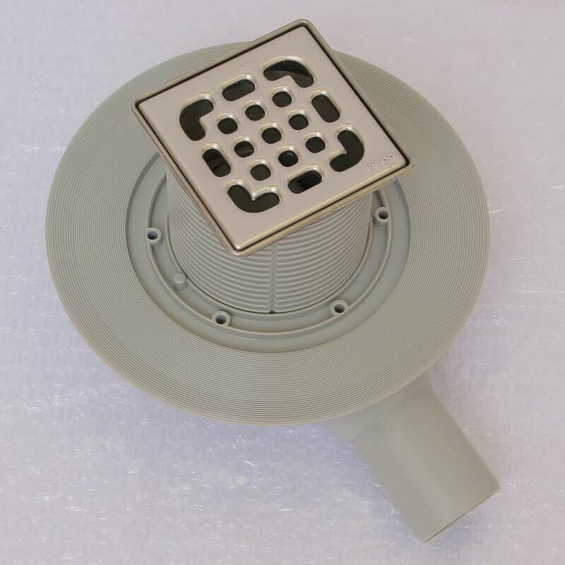 Комплектация: поворотный и регулируемый по высоте надставной элемент 100x100 мм, заглушка, штампованная решетка из нержавеющей стали 1.4301, фланец для нанесения/закрепления гидроизоляции, съемное устройство для защиты от неприятного запаха из системы канализации, ввод для подключения дополнительных сантехприборов DN40, выпуск на шарнирном соединении.