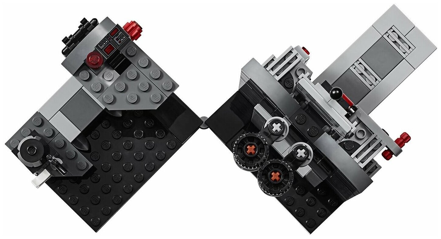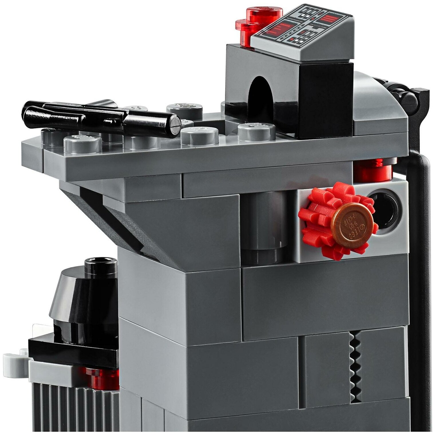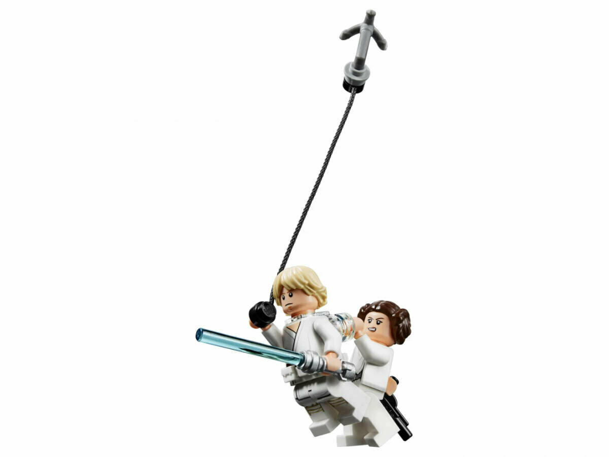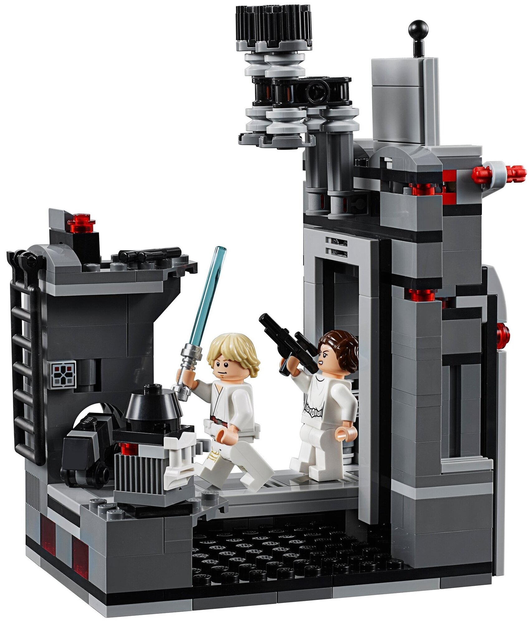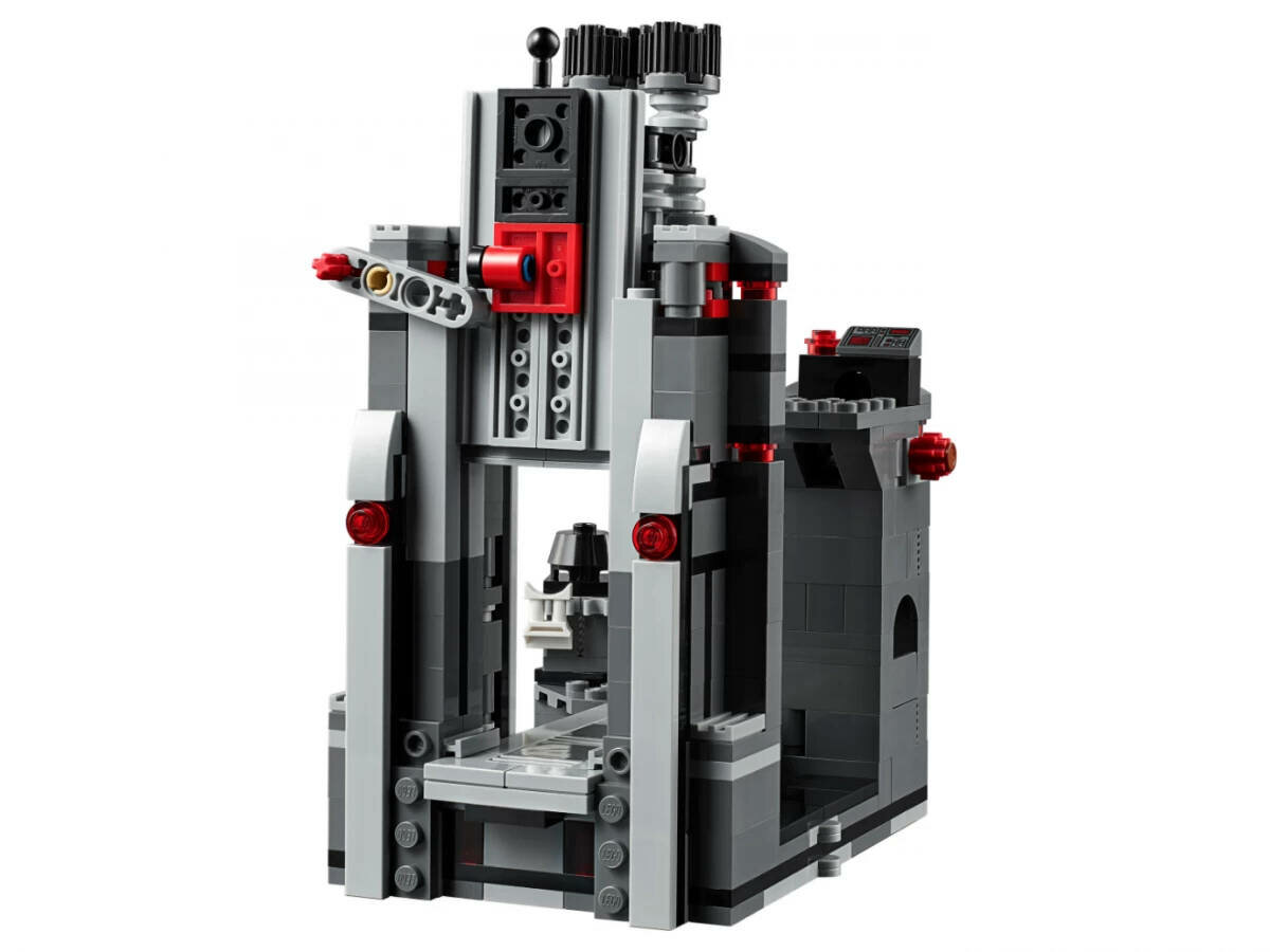 - Орбитальная боевая станция «Звезда смерти» состоит из 2х соединенных между собой конструкций из черных и серых деталей и красных сигнальных ламп. Первая конструкция – это лифт с небольшой платформой, над которым расположена сложная винтовая установка с тросом. На этом тросе минифигурки могут перелетать с одной конструкции на другую. 2я конструкция – высотная стойка с лестницей, на которую забирается Штурмовик и атакует Люка и Лею. Внутри стойки маленький отсек, куда прячется фигурка мыши-дроида.