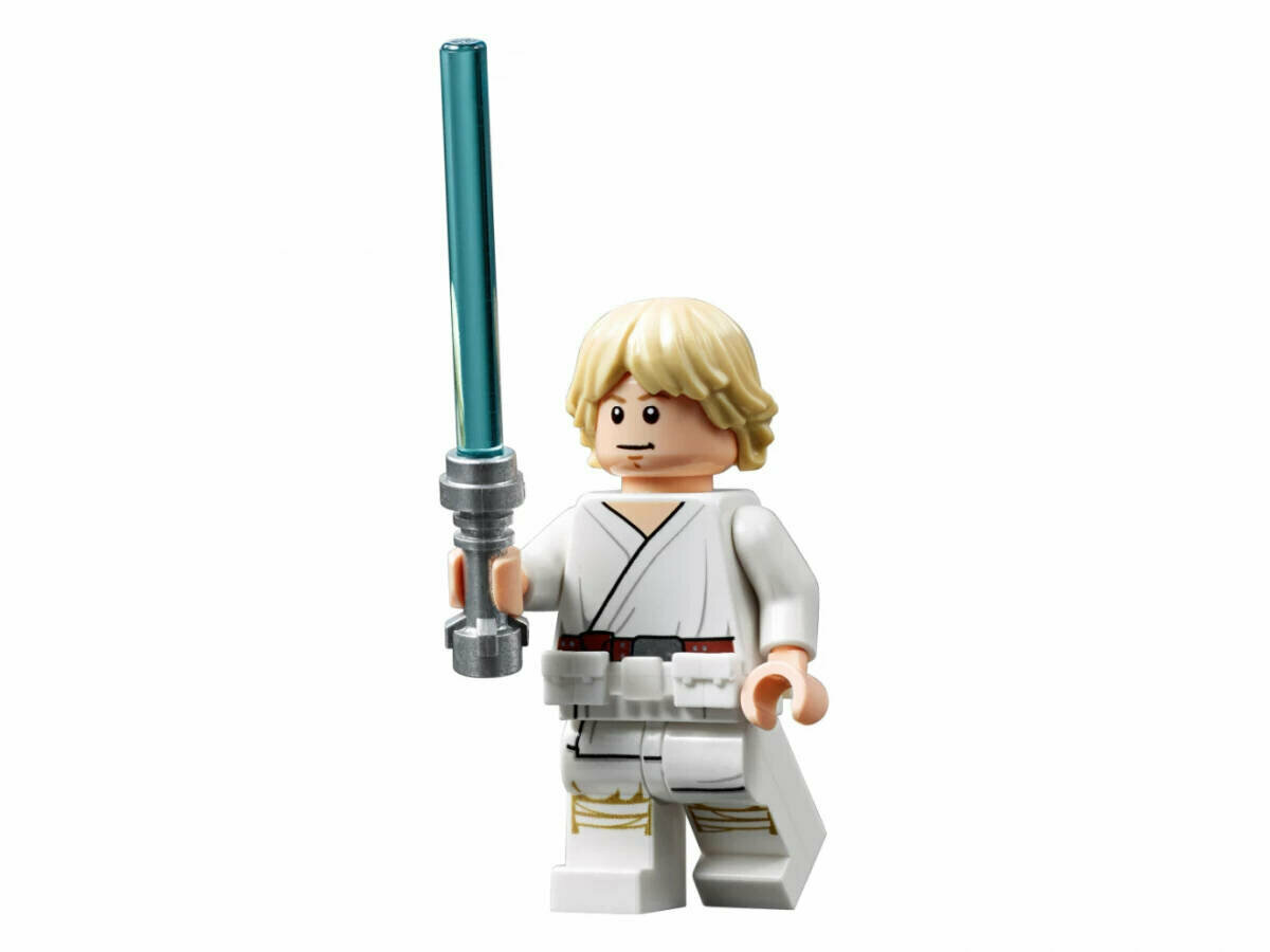 - Люк Скайуокер – мастер-джедай и гранд-мастер нового ордена джедаев. Минифигурка с белыми волосами, в белом джедайском костюме и ремнем, принты на ногах. В руке электронный световой меч синего цвета.
