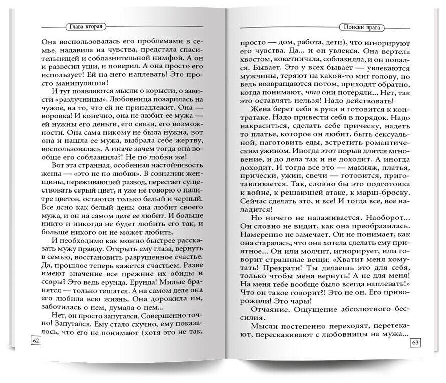 Считаю обязательной к прочтению каждой замужней женщине и чем раньше, тем лучше. Это поможет избежать ошибок в будущем. Но, к сожалению, не всем. А лишь тем, кто хочет и умеет учиться на чужих ошибках. Читая истории женщин, прошедших или проходящих через развод и присутствуя мысленно на каждом "разборе полетов" (психолог комментирует условные "ошибки"), просто волосы встают дыбом. Где-то узнаешь себя и можно взглянуть со стороны на собственное поведение. В любом случае, мой вердикт- очень поучительная книга.