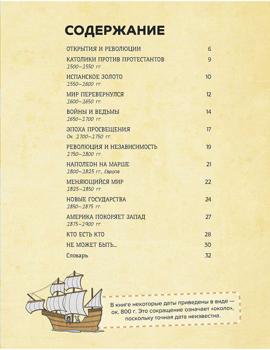 Книга посвящена трём векам (XVI–XVIII вв.) все мирной истории и содержит захватывающие факты этого периода. Европа бурлит событиями, мореплаватели отправляются на покорение новых земель в Америке с Cих несметными богатствами, экспедиция Магеллана совершает первое в истории кругосветное путешествие, в России царь Пётр I строит новую столицу — Санкт-Петербург, во Франции вспыхивает революция, На поле он захватывает огромную территорию — вот далек о не полный перечень ярких событий.