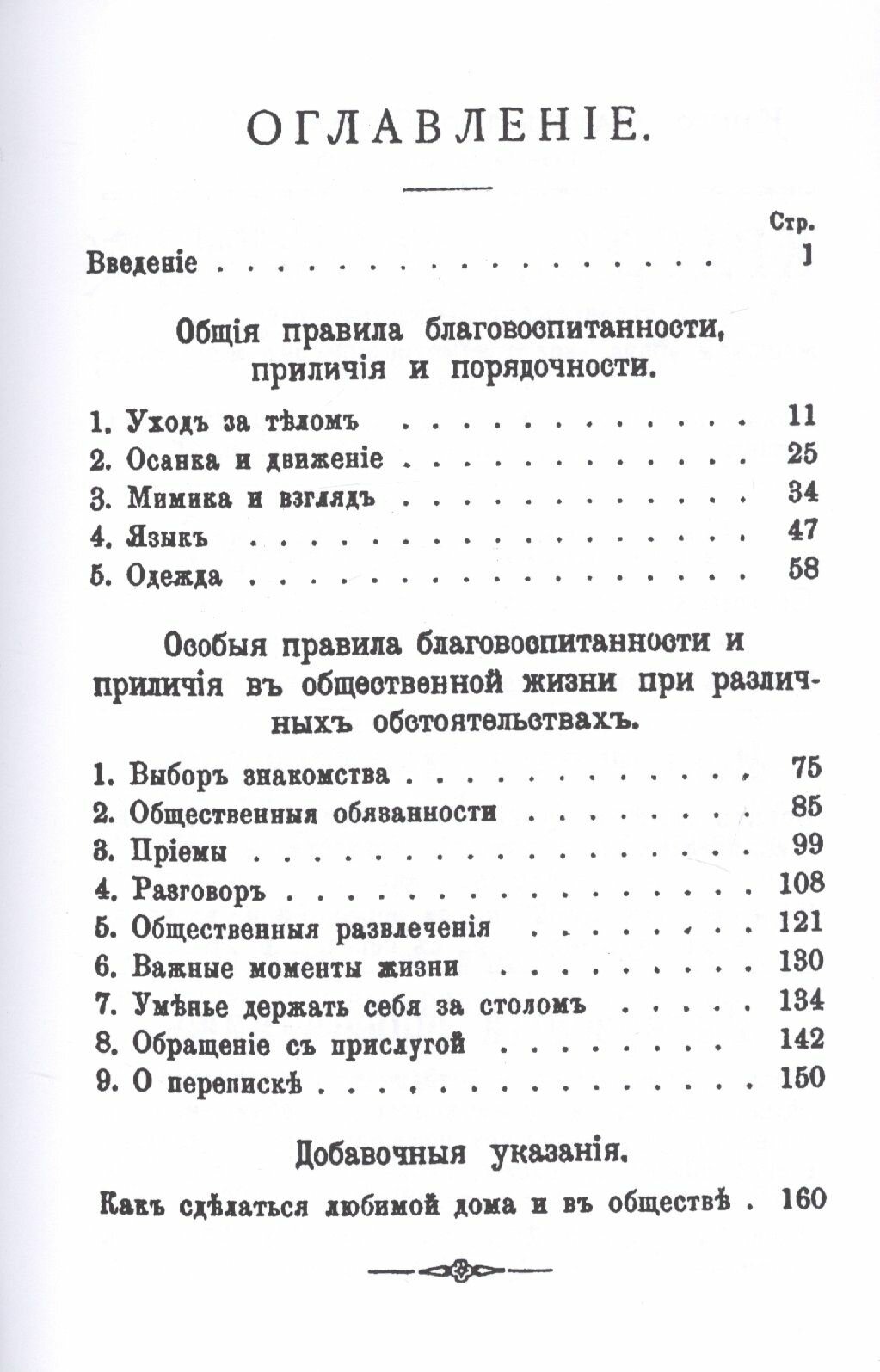 Репринт с издания. СПб., книгоиздательство Герман Гоппе, 1895. Книга содержит указания как сделаться любимой дома и в обществе, зачем мыть голову вином и многих других занимательных и интересных как и с исторической стороны, так и с практической. Значительное место в книге уделено особым правилам, касающимся "ситуативной" стороны этикета - как следует поступать благовоспитанной особе в том или ином случае, чтобы не уронить себя в глазах общества. К последним относятся наставления и советы по выбору знакомств, устройству приемов, обращению с прислугой, умению держать себя за столом и мн. др. В отдельном разделе собраны рекомендации по уходу за фигурой, выработке идеальной осанки, важности взгляда, умению вести разговор и выбору одежды. Книга изготовлена по технологии "печать по требованию". Тираж 30 экз.