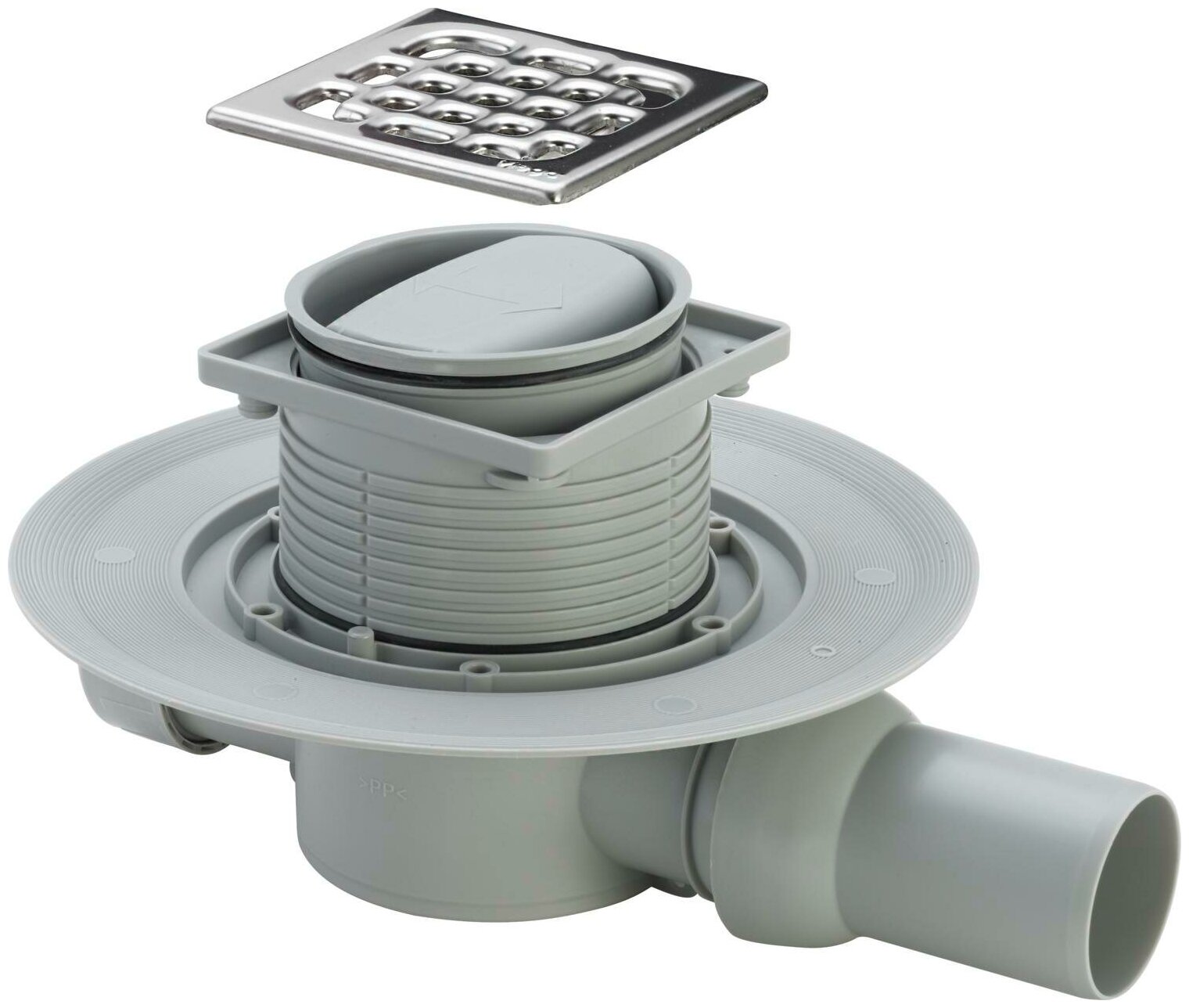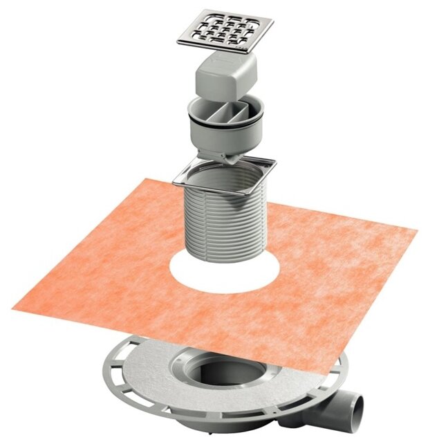 Комплектация: поворотный и регулируемый по высоте надставной элемент 100x100 мм, заглушка, штампованная решетка из нержавеющей стали 1.4301, фланец для нанесения/закрепления гидроизоляции, съемное устройство для защиты от неприятного запаха из системы канализации, ввод для подключения дополнительных сантехприборов DN40, выпуск на шарнирном соединении.