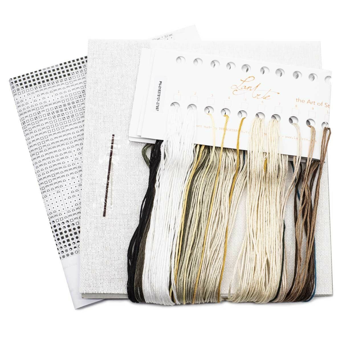 Состав набора: канва 27 каунта, хлопковое мулине DMC (на бумажном органайзере), игла, черно-белая символьная схема, инструкция