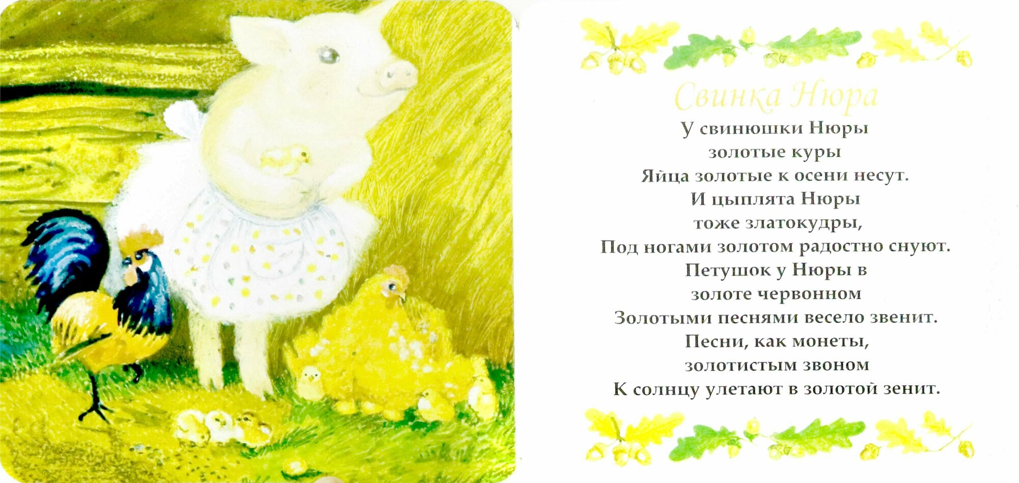 Купила эту книгу на День рождения племяннице, ей 4 года. В книге всего 5 необычных стихотворений о забавных свинках. Их сопровождают очень миленькие рисунки свинок. Стиль очень приятный, показывать такое ребенку - одно удовольствие. Имя художника ничего мне не говорит (Екатерина Голомазова) - но художнику большой плюс! Сами стихи тоже очень хорошие и приятные, добрые.. Свинюшки здесь показаны как люди, они словно маленькие девчонки. А их имена еще больше это подчеркивают. Каждое стихотворение про отдельную свинку, которую зовут как девочку. Это кстати очень понравилось племяннице, ее зовут Ариша и стих про свинку Аришу теперь наш любимый... И форма у книги очень удобная -толстые вспененные страницы - ребенок сам легко переворачивает. Одним словом - отличная книга, единственный минус - маловато, хочется больше!