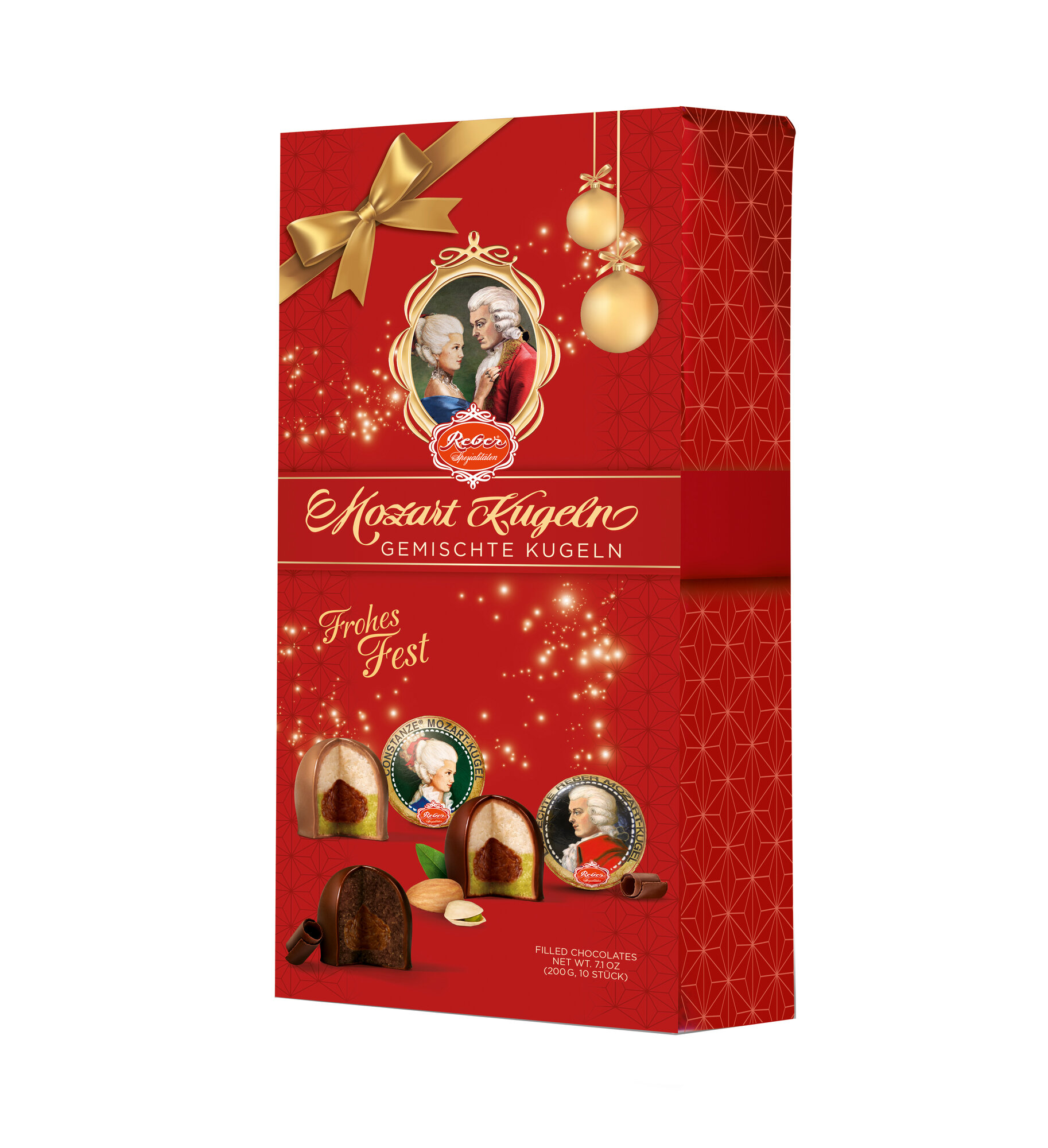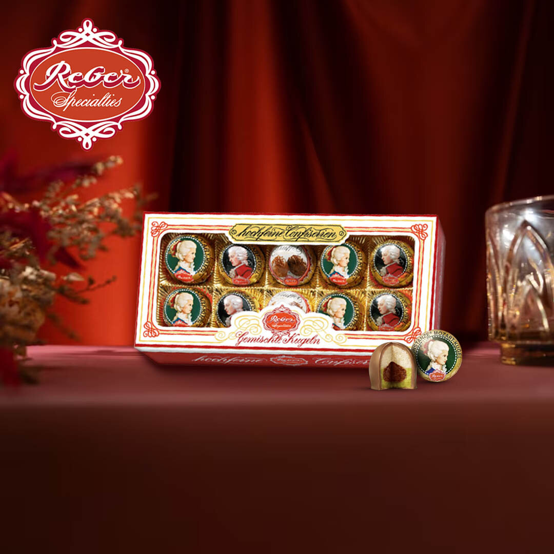 Конфеты Reber Mozart 300г - ассорти шоколадных конфет отменного немецкого качества. В набор вошли три вида легендарных шариков: Constanze (с двухслойным марципаном из зеленых фисташек и миндаля, фундучной нугой и альпийским молочным шоколадом 35%), Reber (с двухслойным марципаном из зеленых фисташек и миндаля, фундучной нугой и горьким шоколадом 60%) и Truffel (с шоколадным марципаном и альпийским молочным шоколадом). Всего - 15 штук. Упакованы в фирменную коробку с прозрачным окошком.
