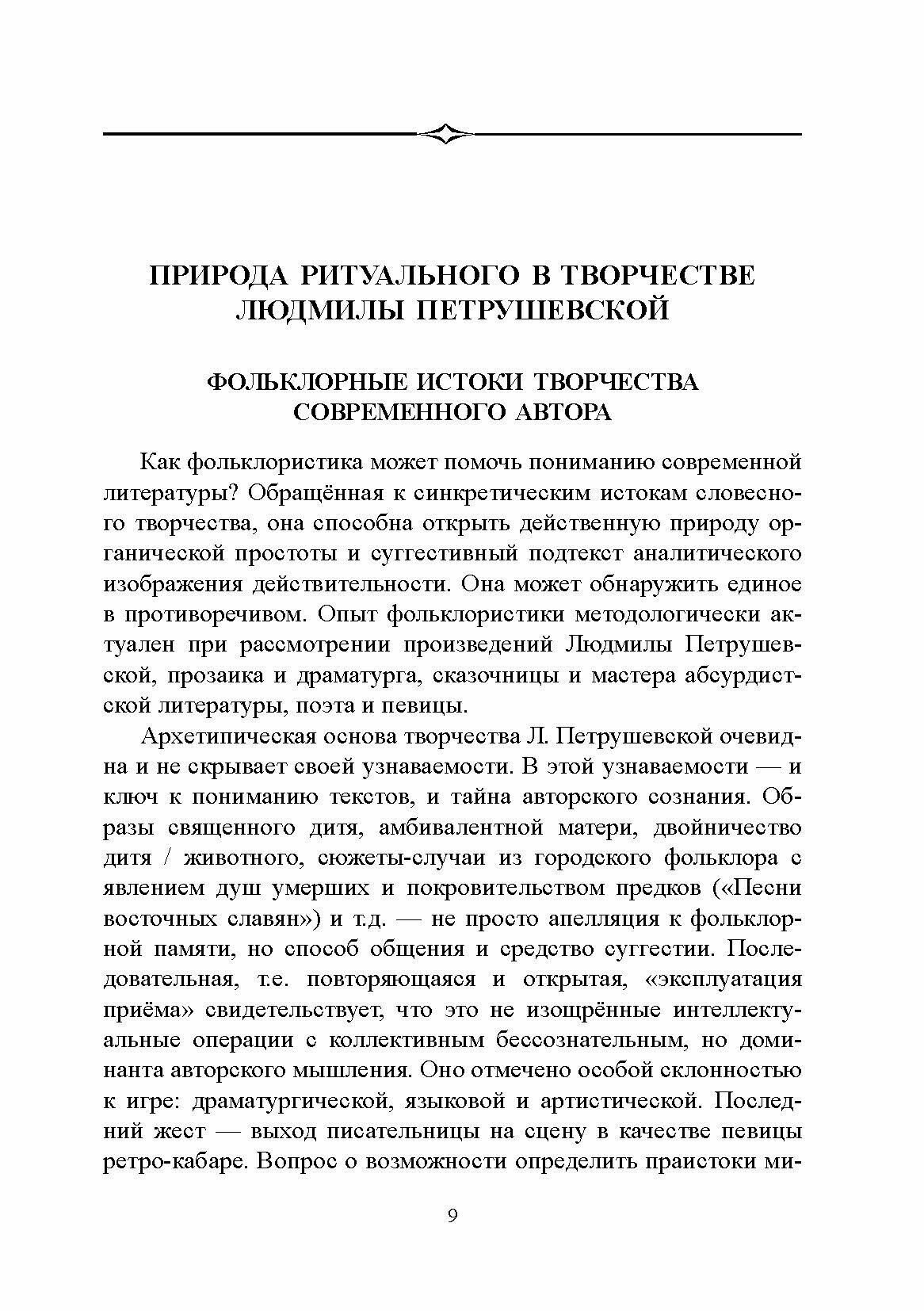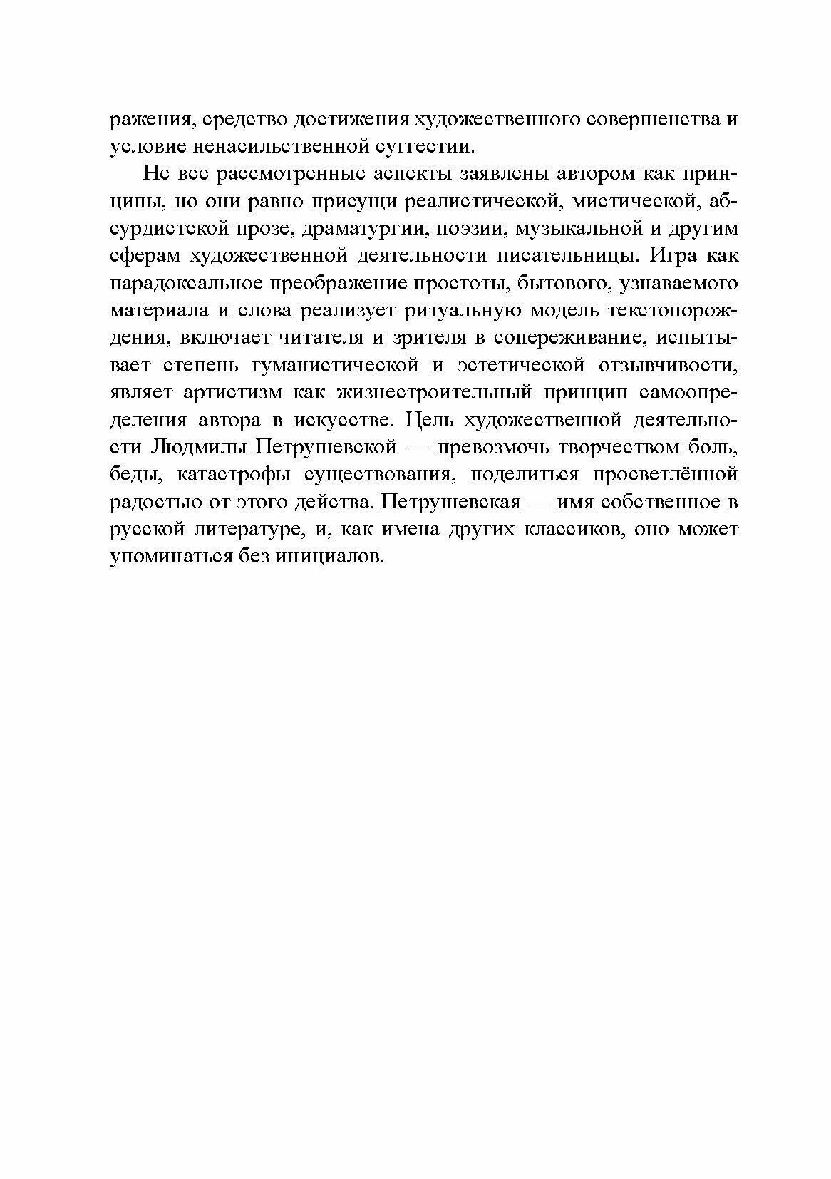 Монография, сложившаяся из ряда доработанных и новых статей, содержит концептуальный анализ базовых характеристик художественного мышления Л. Петрушевской. Это философия творчества как мистериального действа по модели ритуального жертвоприношения, коммуникативные установки, исходящие из понимания структуры сознания, витальная природа смеха, артистический образ творчества. Все характеристики равно присущи реалистической, мистической, абсурдистской прозе, драматургии, поэзии, музыкальной и другим сферам художественной деятельности писательницы. Парадоксальная игра с бытовым материалом и с языком просторечия реализует ритуальную модель текстопорождения, включает читателя и зрителя в сопереживание, испытывает степень гуманистической и эстетической отзывчивости, являет артистизм как жизнестроительный принцип самоопределения и существования автора в искусстве.