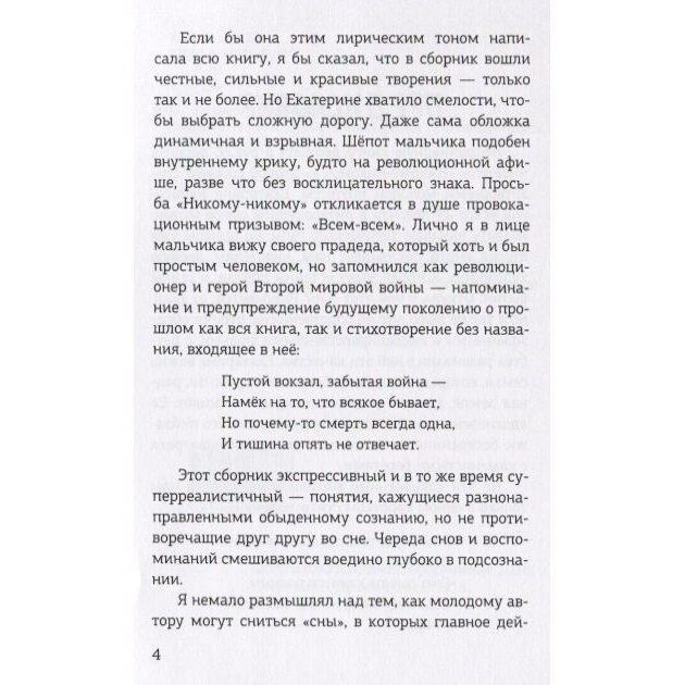 Лично меня этот сборник, как и сетевое творчество Екатерины, заставил несколько скорректировать отношение к поэзии. Коротко о моём мнении касательно творчества поэтессы в целом и этого сборника в часности: если литераторы когда-нибудь будут исследовать Россию 21 века в контексте поэзии и упустят работы Екатериной Рупасовой из виду, это будет фиаско :)