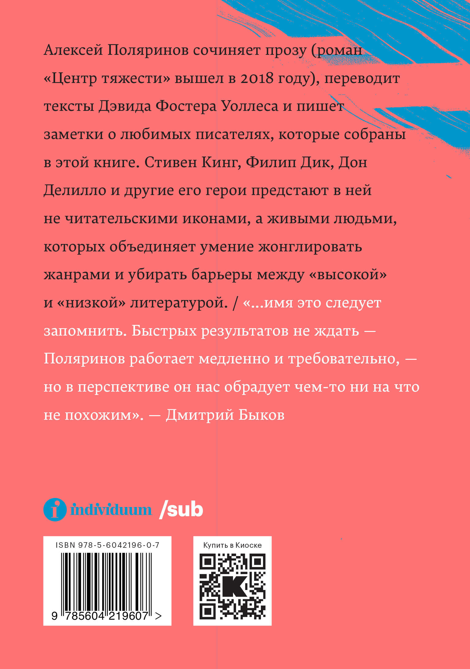 Алексей Поляринов сочиняет прозу (роман "Центр тяжести" вышел в 2018 году), переводит тексты Дэвида Фостера Уоллеса и пишет заметки о любимых писателях, которые собраны в этой книге. Стивен Кинг, Филипп Дик, Дон Делилло и другие его герои предстают в ней живыми людьми, а не читательскими иконами, которых объединяет умение жонглировать жанрами и убирать барьеры между "высокой" и "низкой" литературой.