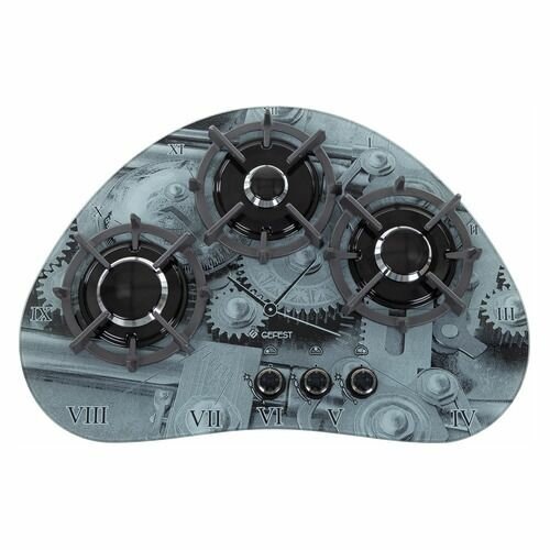 Варочная панель Гефест 2120 К1 из закаленного стекла имеет необычную асимметричную форму и декорирована изображением часового механизма. Такая техника идеально впишется в современную кухню, выполненную в схожих серых цветах. Варочный стол снабжен тремя горелками, снабженными индивидуальными чугунными решетками.