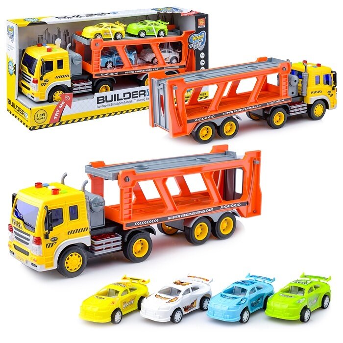 Набор состоит из автовоза 38 см и четырех машинок (8 см). Трейлер выполнен в масштабе 1:16. Рекомендованный возраст с 3 лет