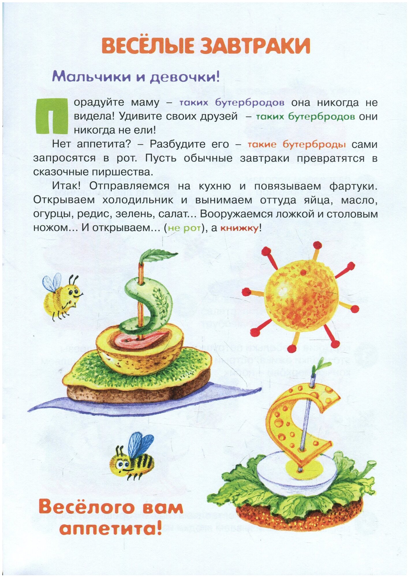 Ты, наверное, не раз видел, как мама стоит на кухне у плиты, чтобы к празднику порадовать тебя и всех родных чем-нибудь вкусненьким. Думаешь, это трудно и неинтересно? А ты попробуй! Мы начнем с бутербродов. Порадуй маму – таких бутербродов она никогда не видела! Удиви своих друзей – таких бутербродов они никогда не ели! А если нет аппетита? – Разбуди его – такие бутерброды сами запросятся в рот. Пусть обычные завтраки превратятся в сказочные пиршества.
