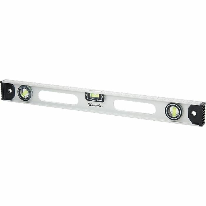 Уровень Matrix подходит для выравнивания горизонтальных, вертикальных и наклонных поверхностей. В последнем случае выравнивание может производиться под произвольным углом: данная возможность обеспечена благодаря наличию ампулы поворотного типа. Используя линейку, вы также сможете использовать уровень для линейных измерений. Длина шкалы равна 100 см.
