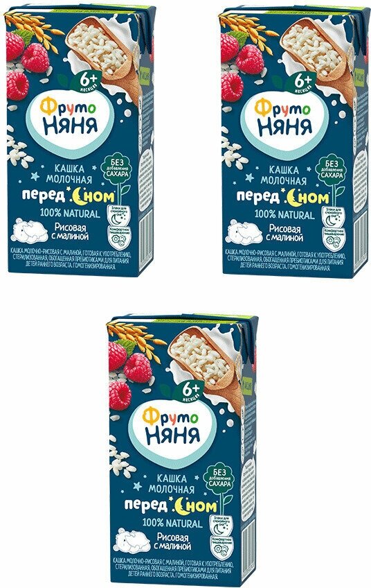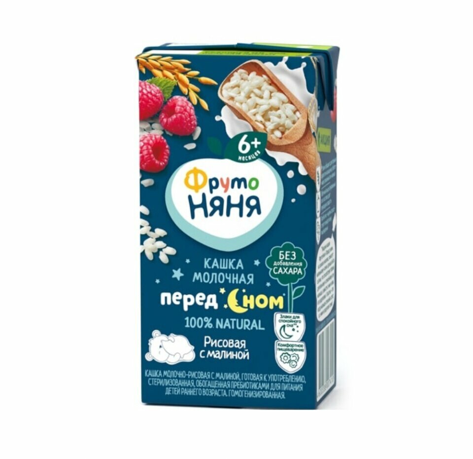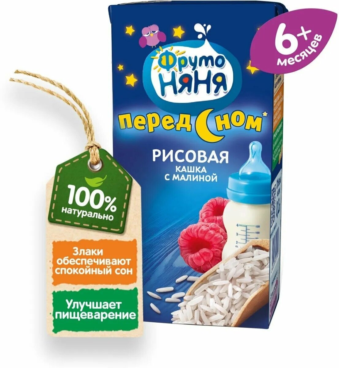 Каша ФрутоНяня Молочно-рисовая с малиной 200г рекомендована детям с 6 месяцев для расширения рациона. 100% натуральный, вкусный готовый продукт, обладающий приятным ароматом малины. Рис не содержит глютен. Он выводит из организма шлаки и токсины, помогает улучшить пищеварение и обмен веществ. В нем много витаминов и минералов. В составе имеется пребиотик – инулин, способствующий нормализации микрофлоры кишечника. Кашу можно предложить крохе перед сном, ведь она обладает длительным эффектом насыщения. Имеет жидкую консистенцию, поэтому ее можно пить из детской бутылочки или через трубочку. Удобно брать с собой на прогулку, в гости или в дорогу.