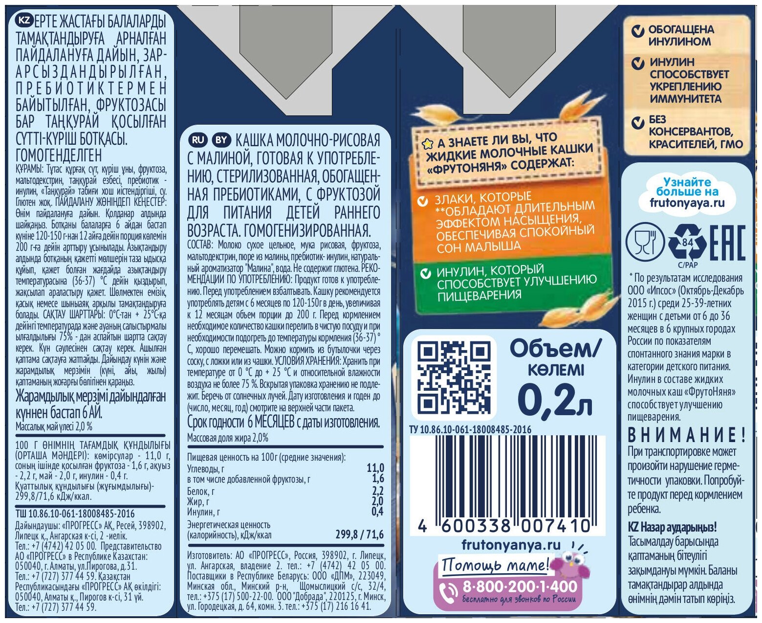 | Состав | Молоко сухое цельное, мука рисовая, концентрированный яблочный сок, мальтодекстрин, пребиотик-инулин, пюре из малины, натуральный ароматизатор "Малина", вода. Не содержит глютена. Содержит сахара природного происхождения. |