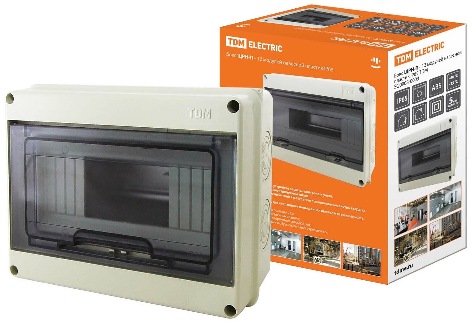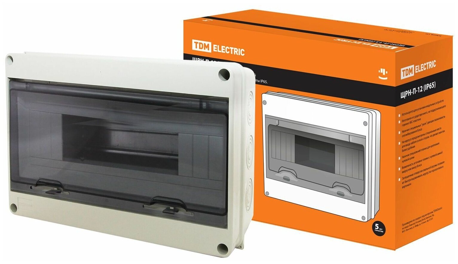 Бокс ЩРН-П-12 модулей навесной пластик IP65 TDM Область применения розничная торговля; строительно-монтажные организации. Назначение для установки модульной аппаратуры защиты, управления и контроля номиналом до 63A. Применение в жилых, общественных и подсобных помещениях. Материалы ударопрочный, не поддерживающий горение АБС-пластик, устойчивый к ультрафиолету. Преимущества Отверстия для крепления позволяют легко и быстро осуществлять монтаж. На корпусе предусмотрены выбивные отверстия для ввода кабеля со всех сторон. Большое пространство вверху и внизу бокса позволяет свободно осуществлять монтаж и дает возможность размещения дополнительных устройств распределения (клеммников, сжимов и т.д.). Возможность полной опломбировки бокса (корпуса и крышки) позволяет использовать бокс для установки устройств учета (счетчиков и т.д.).