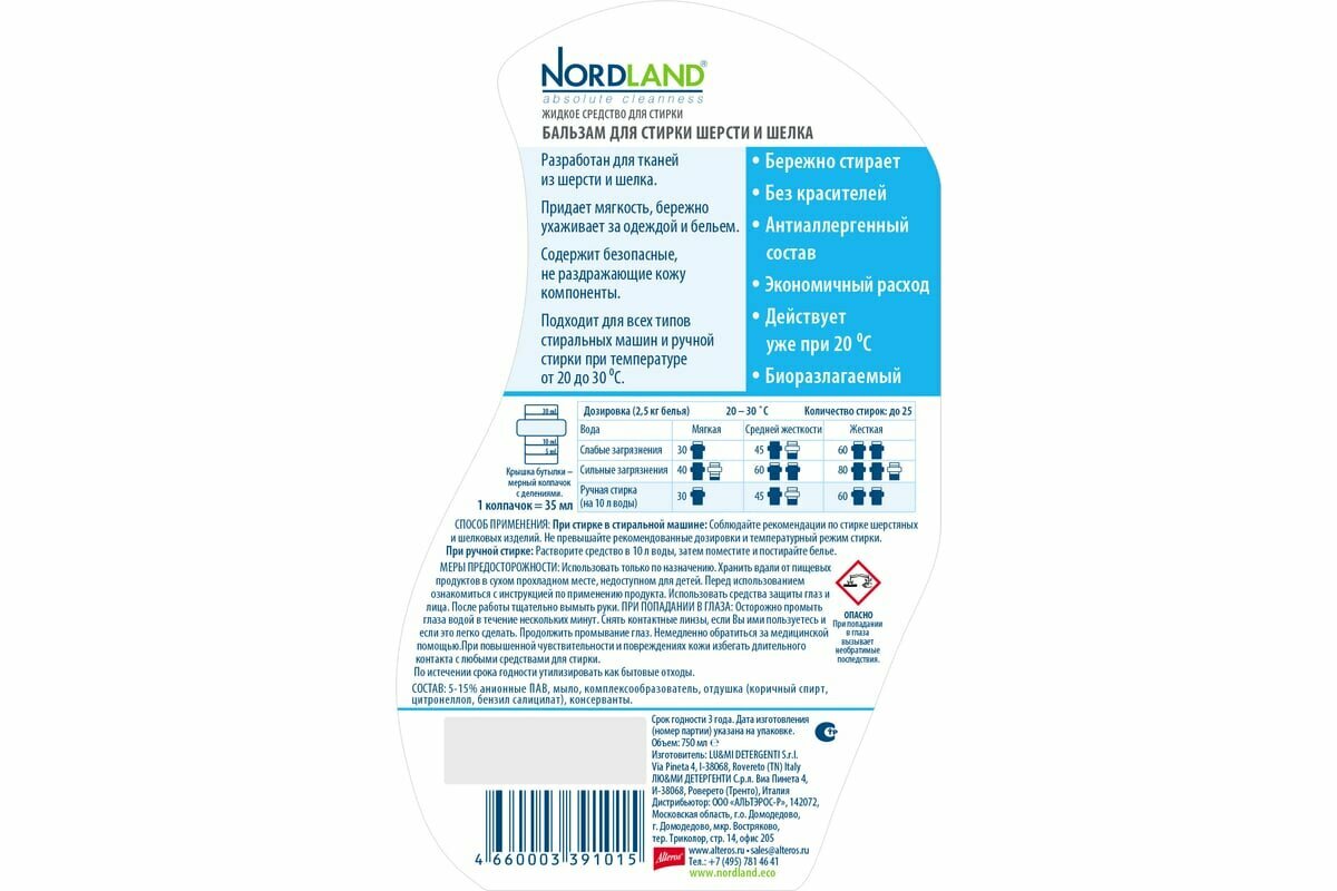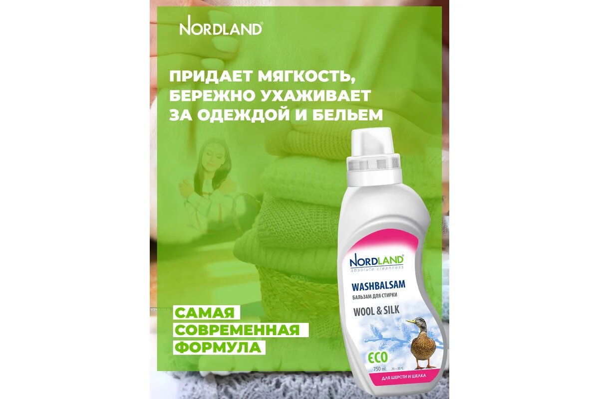 Nordland бальзам для стирки шерсти и шелка, 750 мл. Предназначен для стирки тканей из шерсти и шелка. Придает мягкость, бережно ухаживает за одеждой и бельем. Содержит безопасные, не раздражающие кожу компоненты.