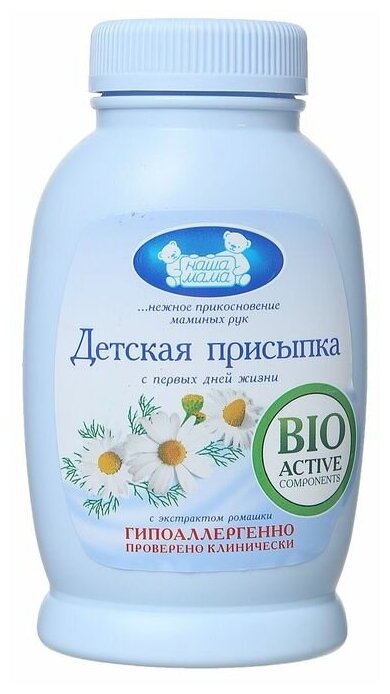 Одно из незаменимых средств в уходе за младенцами первого года жизни – детская присыпка. Присыпка «Наша мама» разработана с учетом особенностей обменных процессов в организме грудного ребенка, прошла дополнительные клинические испытания и рекомендована для ухода за чувствительной и склонной к опрелостям кожей. Оказывает выраженное профилактическое и благоприятное подсушивающее воздействие.