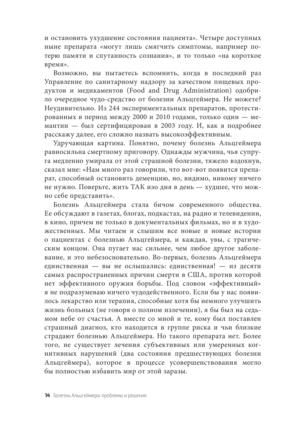 Добротный труд, очень насыщенная книга, это не для быстрого чтения. Кому требуется глубокое знание и понимание, могут читать досконально и в подробностях, люди «попроще», скорее всего, пропустят некоторые научные моменты, но почерпнут нечто полезное, что уменьшит страх перед болезнью Альцгеймера, перестанут чувствовать обреченность и смогут бороться за полноценную жизнь, свою или близких.