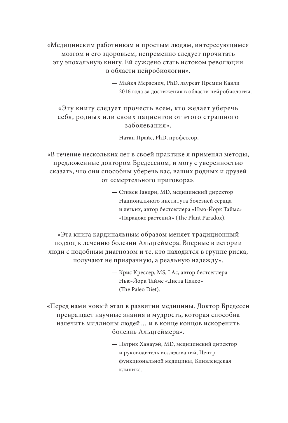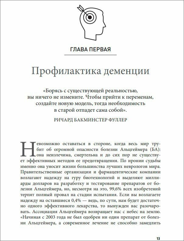 Как врач невролог, который занимается проблемами памяти, и отец которого в 65лет также страдает болезнью Альцгеймера, подтверждаю, что все рекомендации основаны на серьезных научных данных и длительных наблюдениях. Мне очень понравилось, изложение ясное и логичное, когда читаешь все это вот так вместе, возвращается чувство уверенности. Однозначно буду рекомендовать своим пациентам