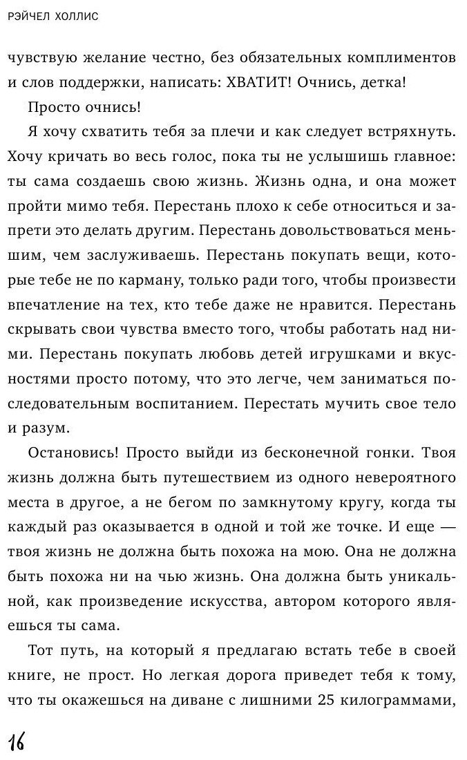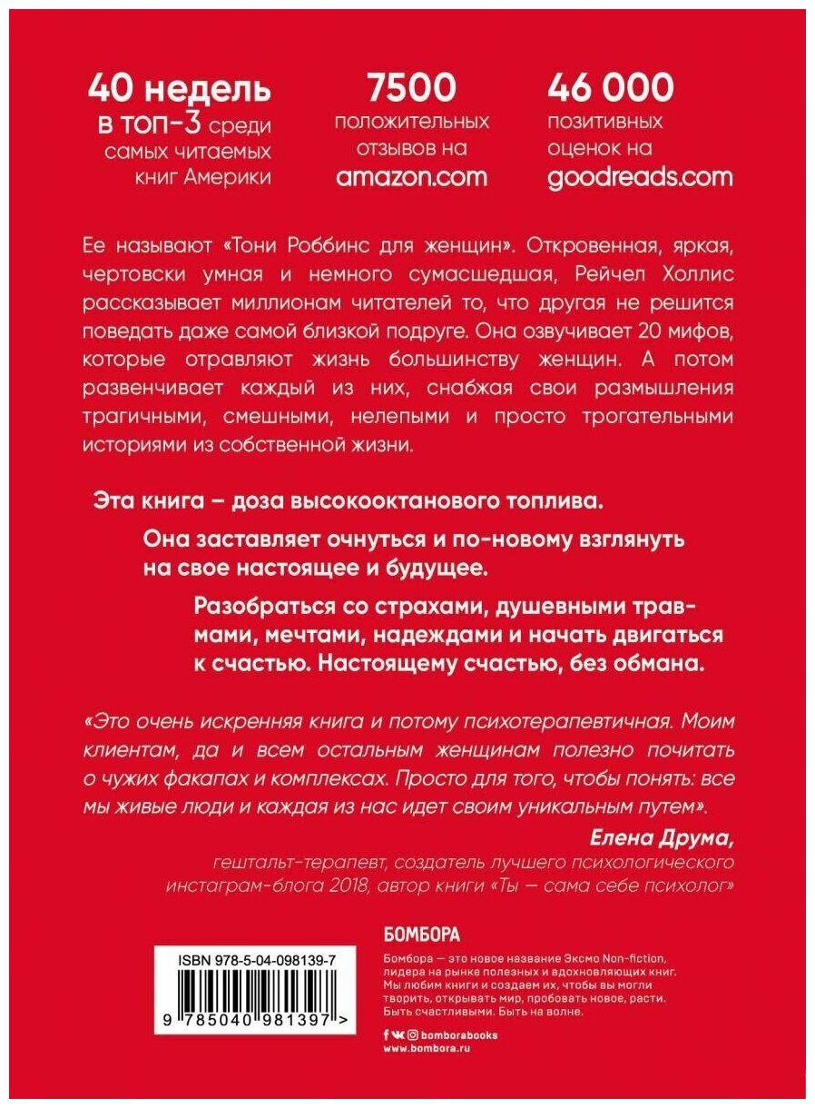 Ее называют "Тони Роббинс для женщин". Откровенная, яркая, чертовски умная и немного сумасшедшая, Рейчел Холлис рассказывает миллионам читателей то, что другая не решится поведать даже самой близкой подруге. Она озвучивает 20 мифов, которые отравляют жизнь большинству женщин. А потом развенчивает каждый из них, снабжая свои размышления трагичными, смешными, нелепыми и просто трогательными историями из собственной жизни. Эта книга – доза высокооктанового топлива. Она заставляет очнуться и по-новому взглянуть на свое настоящее и будущее. Разобраться со страхами, душевными травмами, мечтами, надеждами и начать двигаться к счастью. Настоящему счастью, без обмана.