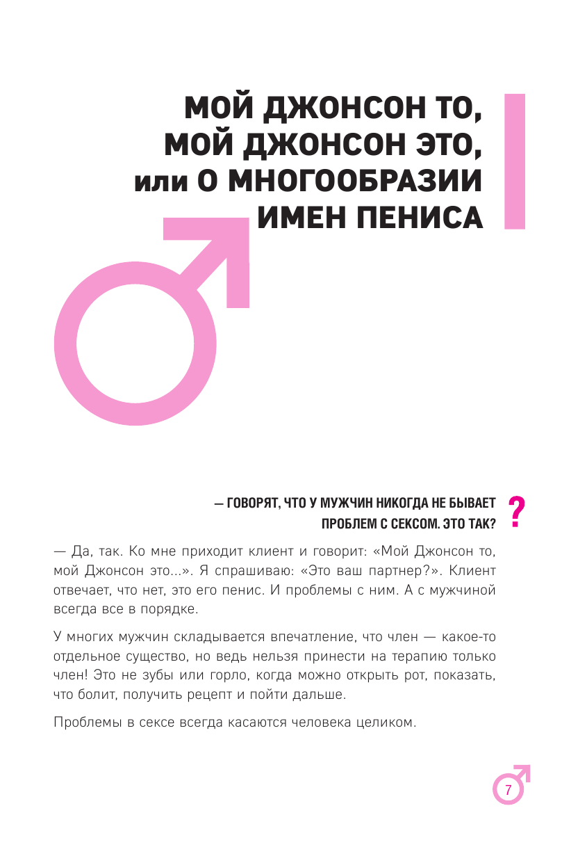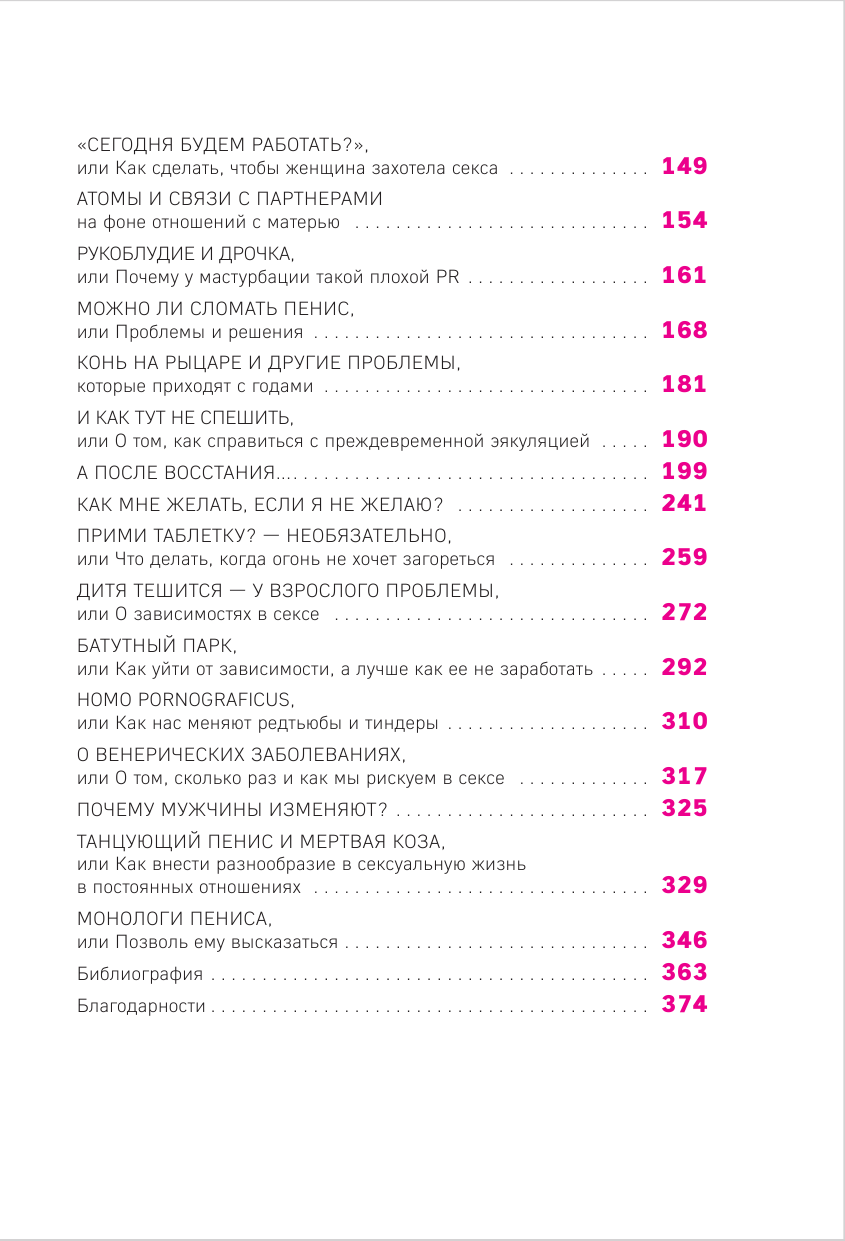 Очень странный формат книги: вопрос невидимого собеседника и ответы автора. Содержание тоже довольно неоднозначное – секспросвет из научных фактов перемежается откровенной отсебятиной. Изначальная задумка в том, чтобы сделать книгу как дружеский диалог «между нами, мальчиками», но выглядит он местами очень неуместно и фамильярно. Если вы привыкли к более академическому стилю, этот может не зайти.