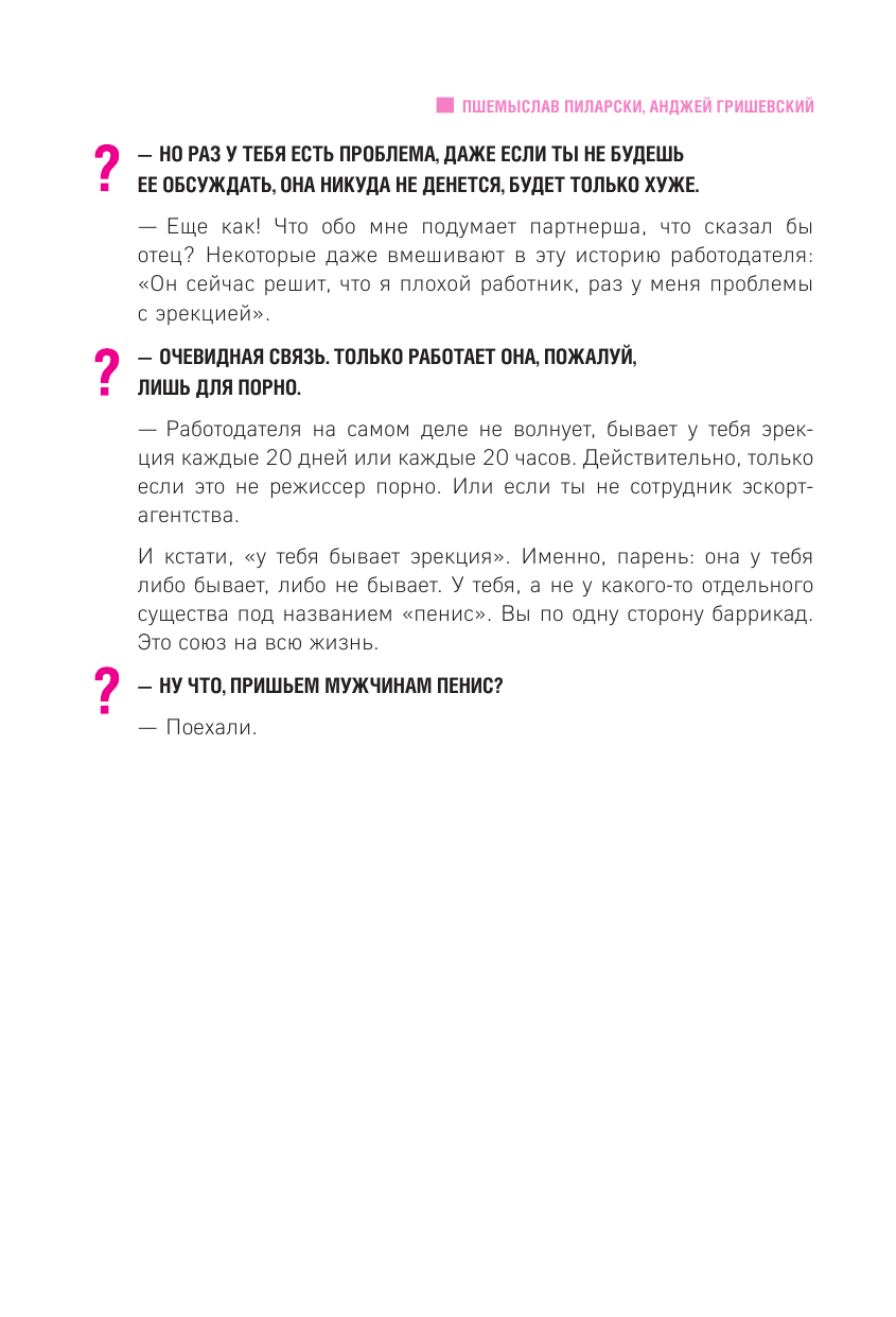 В наши дни секс становится роскошью: согласно данным исследований, у каждого третьего мужчины, состоящего в отношениях, его нет. Порнография создаёт завышенные ожидания и неправильные представления, а фармкомпании пытаются продать средства для увеличения пениса. При этом мужчины, как правило, стесняются обсуждать проблемы, возникающие в интимной сфере, хотя для них это одна из самых животрепещущих тем с момента полового созревания. Авторы этой книги помогут начать непростой разговор, распрощаться с мифами, навязанными нам культурой, принять свое тело и построить полноценную сексуальную жизнь, приносящую радость себе и партнёру.