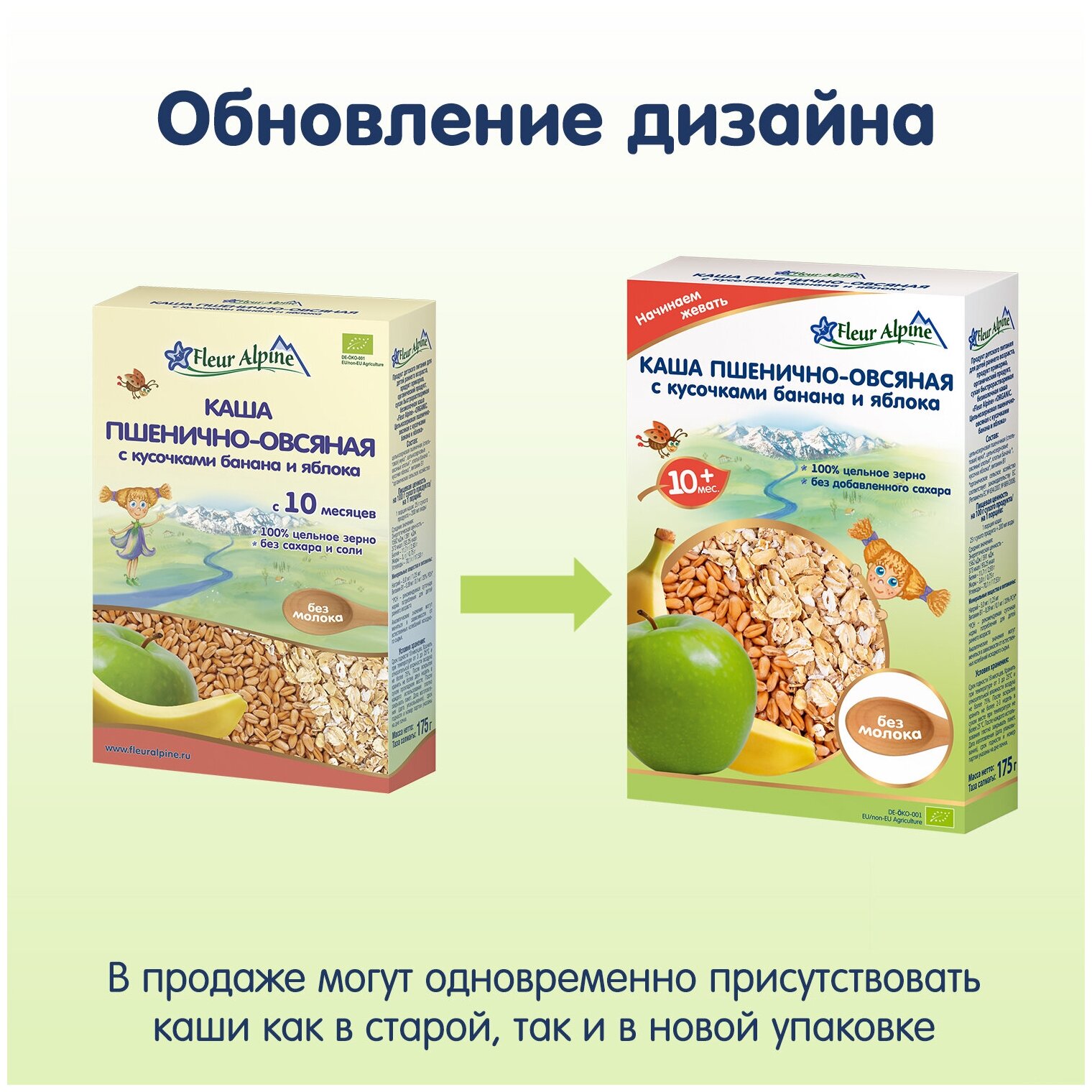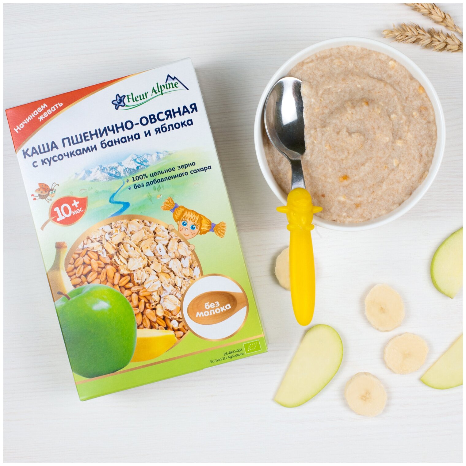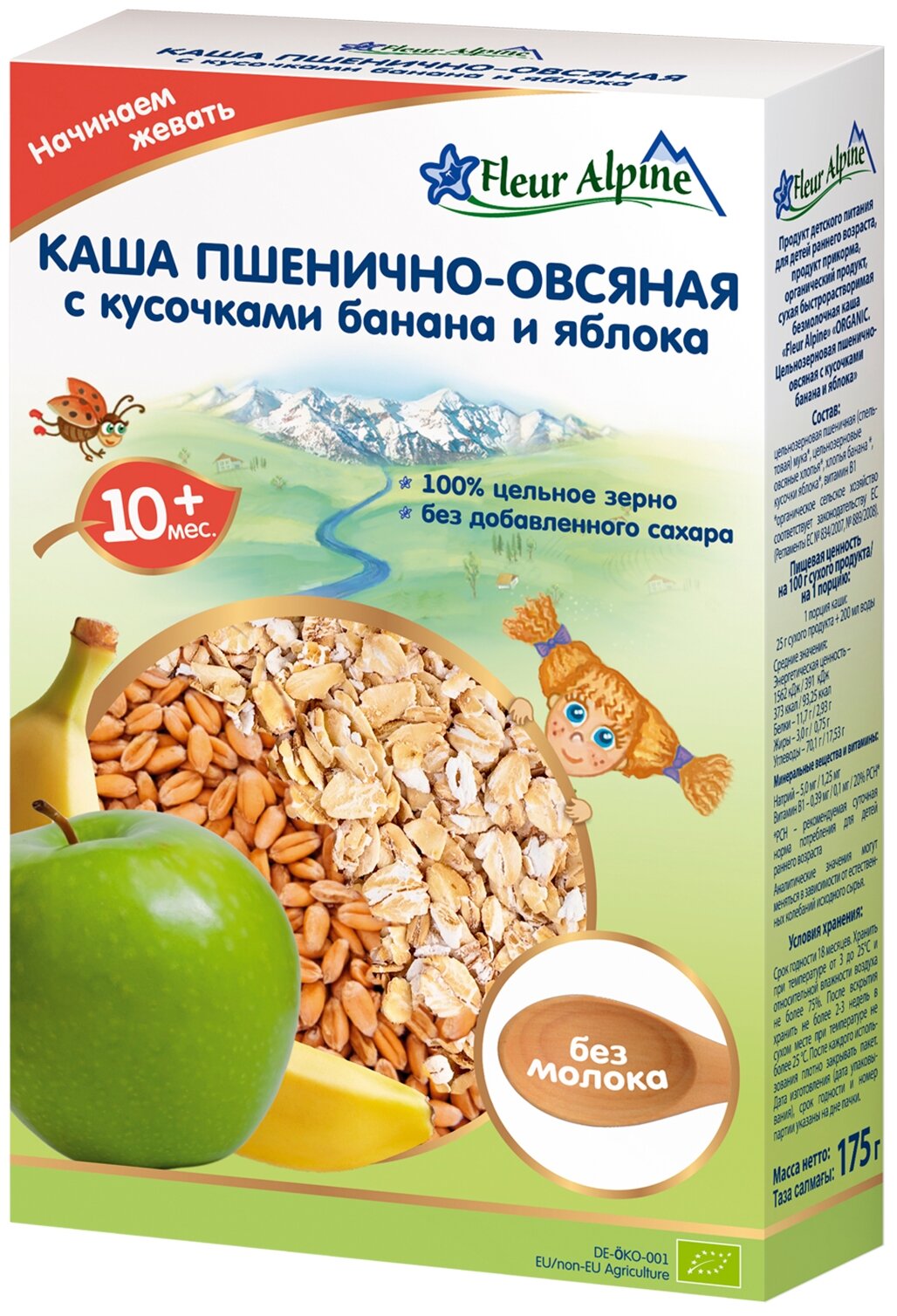 Каша безмолочная Fleur Alpine Пшенично-овсяная с кусочками банана и яблока для детей старше 10 месяцев. Не содержит следов молока. Без добавленного сахара. Изготовлена из высококачественного цельного зерна, предназначенного для питания детей. Разводится легко, быстро и без комочков.