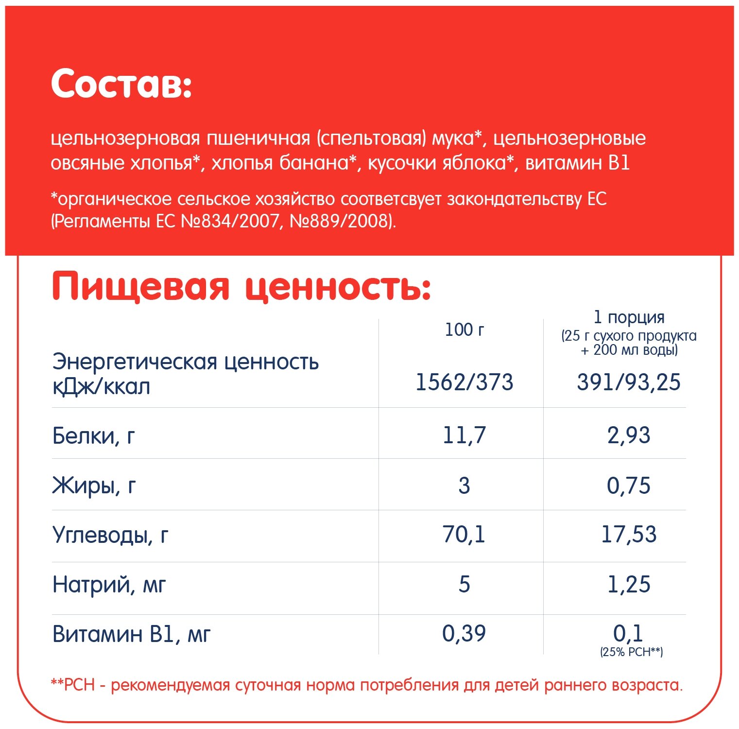 Состав: цельнозерновая пшеничная (спельтовая) мука*, цельнозерновые овсяные хлопья*, хлопья банана*, кусочки яблока*, витамин B1.