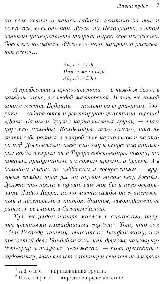 "гуляка, танцор, говорун, выпивоха, бунтарь, мятежник, забастовщик, демонстрант, гитарист, влюбленный, пылкий любовник, писатель, ученый, колдун", и перед глазами читателя разворачивается его удивительная, насыщенная, яркая жизнь и вечная борьба. "Лавка чудес" - это дом Аршанжо и его друга Лидио, место, где они творили свои чудеса: картины, книги, представления и театр теней. Чудеса для бедняков и для богачей, для белых и черных, для всех, кому хочется получить немного радости и волшебства. Ведь в "Лавке чудес" всё может случиться. И случается.