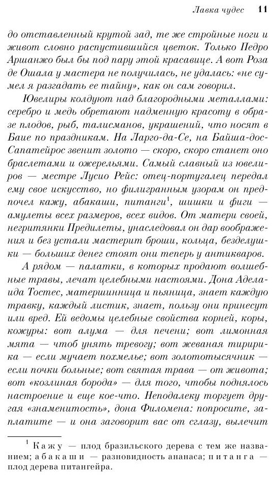 "Когда все дружным хором говорят "да", я говорю — "нет". Таким уж уродился", — писал о себе Жоржи Амаду и вряд ли кривил душой. Кто лжет, тот не может быть свободным, а именно этим качеством — собственной свободой — бразильский эпикуреец дорожил больше всего. У него было множество титулов и званий, но самое главное звучало так: "литературный Пеле". И это в Бразилии высшая награда. Жоржи Амаду написал около 30 романов, которые были переведены на 50 языков. По его книгам поставлено более 30 фильмов, и даже популярные во всем мире бразильские сериалы начинались тоже с его героев. "Лавкой чудес" назвал Амаду один из самых значительных своих романов, "лавкой чудес" была и вся его жизнь. Роман написан в жанре магического реализма, и появился он раньше самого известного произведения в этом жанре — "Сто лет одиночества" Габриэля Гарсиа Маркеса.