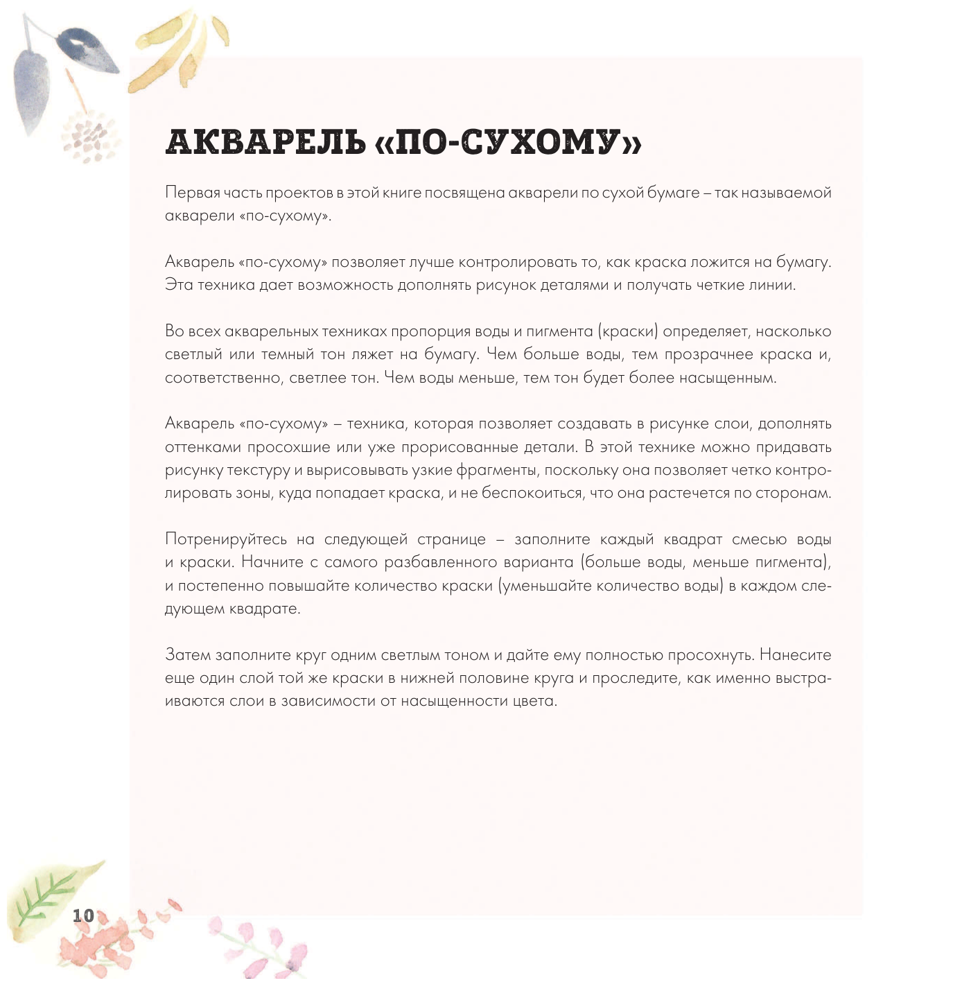 Эта большеформатная книга-альбом (23х23 см) - замечательная возможность начать рисовать акварельными красками. Простые пояснения и контуры на белом листе помогают выполнить рисунок. Постранично задания усложняются - от упражнения с тёмными и светлыми тонами к простым рисункам акварелью "по-сухому", потом "по-сырому", затем рисование чернилами и акварелью. Книжка поможет сделать старт и рисовать понемножку, в своём темпе и в своё удовольствие. Хорошая идея книги и прекрасное её воплощение.