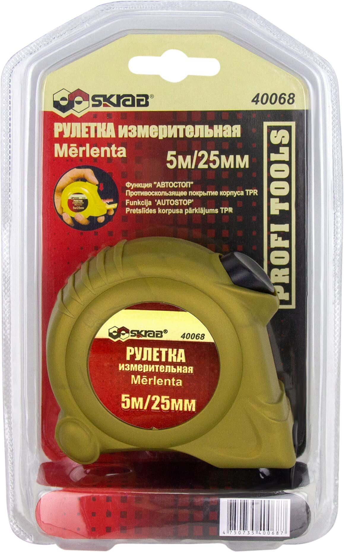 Корпус рулетки измерительной изготовлен из прорезиненного ударопрочного пластика, имеет пылеотталкивающее покрытие. Лента выполнена из качественной углеродистой стали с эмалевым покрытием и высоким показателем износоустойчивости, позволяет производить измерения в горизонтальной и вертикальной плоскости без излома полотна. Лента имеет двухстороннюю шкалу для удобства разметки. Рулетка Скраб имеет одну жесткую фиксацию, позволяющую оставлять ленту в выдвинутом состоянии на неограниченное время. Рулетка имеет мощный механизм возврата ленты, что позволяет быстро вернуть ленту в исходное положение. Металлический крючок надежно крепится к ленте при помощи трех заклепок.