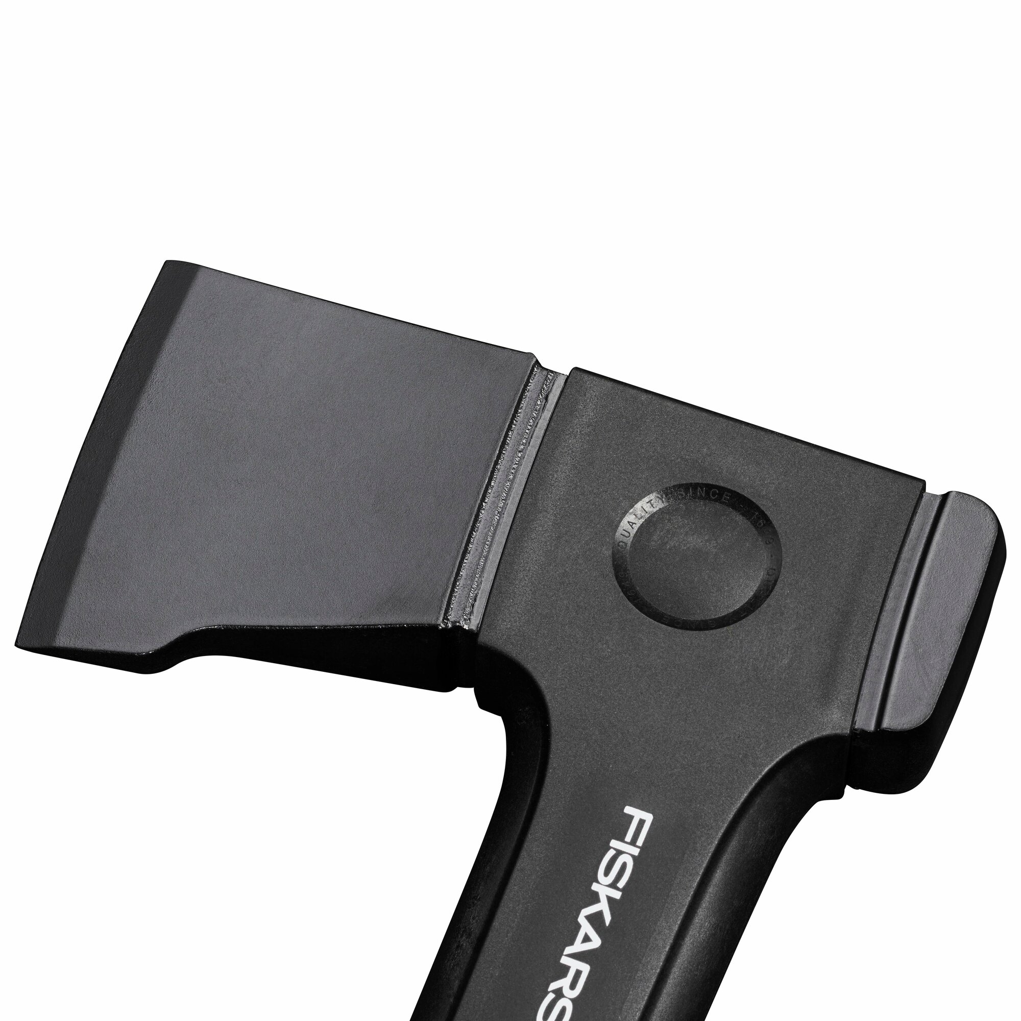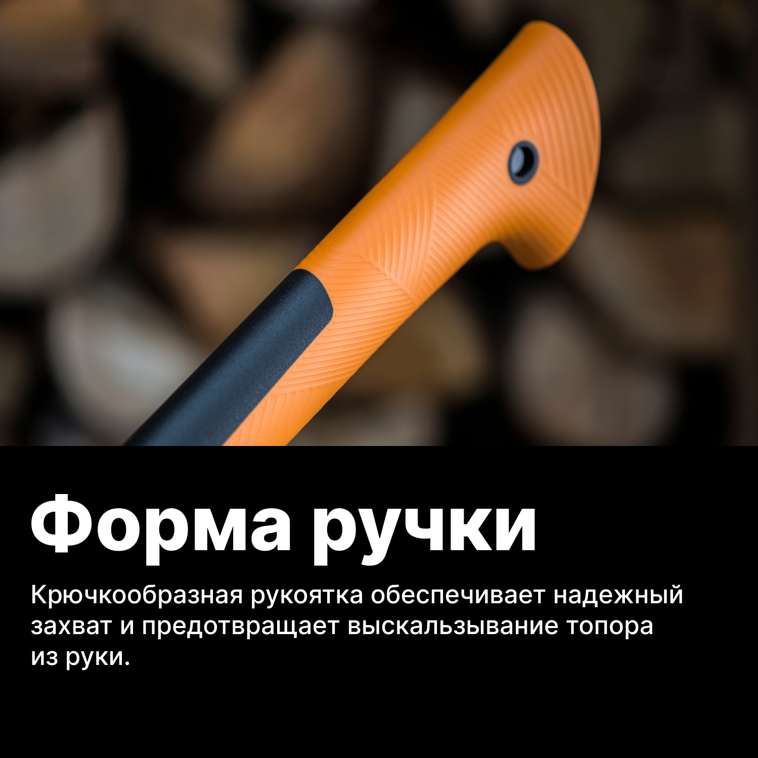 Универсальный топор Fiskars X10 предназначен для выполнения разнообразных столярных и плотницких работ, рубки небольших деревьев и кустарников. Выпуклое лезвие выполнено из стали с тефлоновым антикоррозийным покрытием и имеет угол заточки 30°, оно легко извлекается из бревна. Износоустойчивое топорище из современного легкого материала с мягким структурным покрытием обеспечивает надежный захват инструмента, а крючкообразная рукоятка исключает выскальзывание.