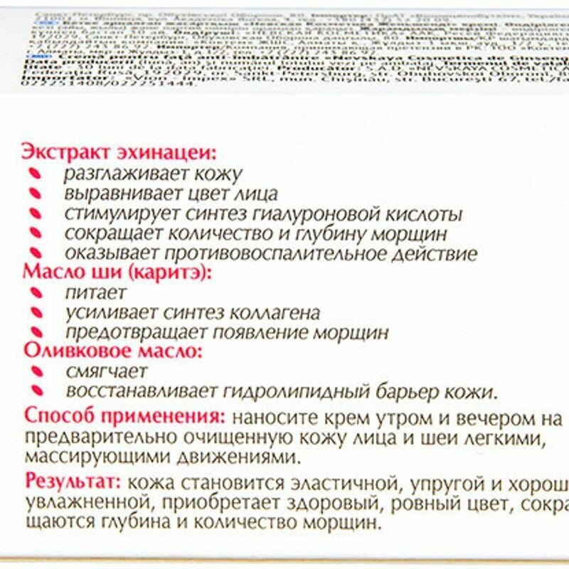 | Химический состав | Aqua, Olea Europaea (Olive) Oil, Glycerin, Isopropyl Myristate, Butyrospermum Parkii Oil, Propylene Glycol, Panax Ginseng Root Extract, Cetearyl Аlcohol, Glyceryl Stearate , Cуclopentasiloxane, Echinacea Purpurea Extract, Tocopheryl Аcetate, Glyceryl Stearate Citrate, Carbomer, Тriethanolamine, Parfum, Phenoxyethanol, Methylparaben, Propylparaben, Methylisothiazolinone |