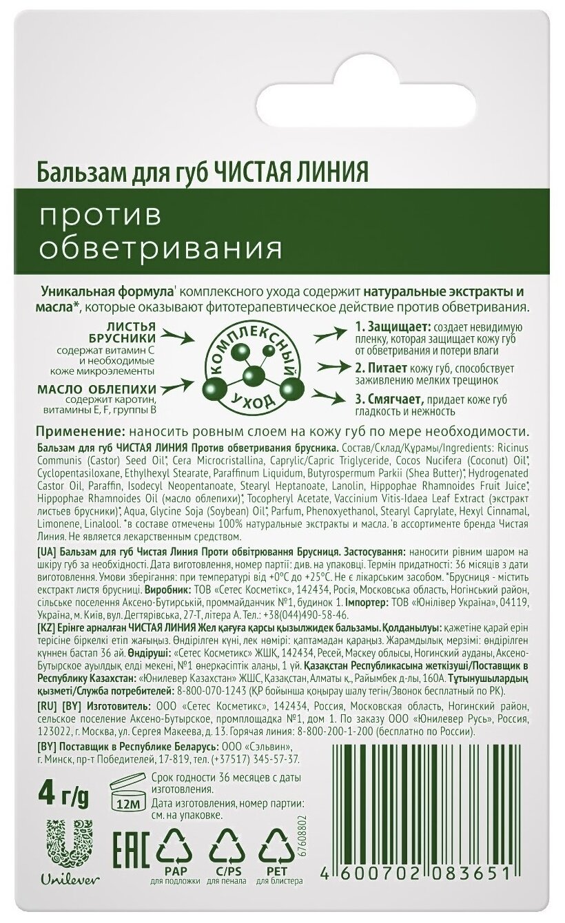 Чистая линия Бальзам для губ Против обветривания брусника 4 г