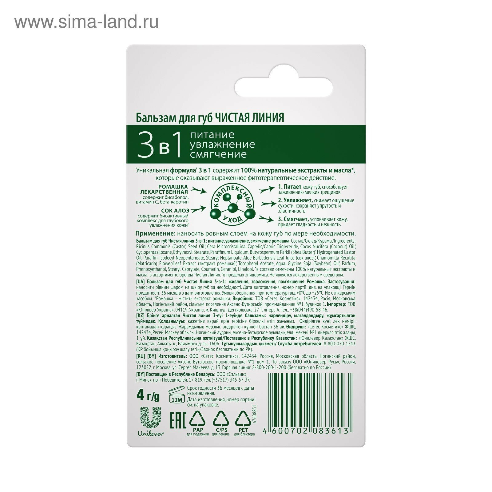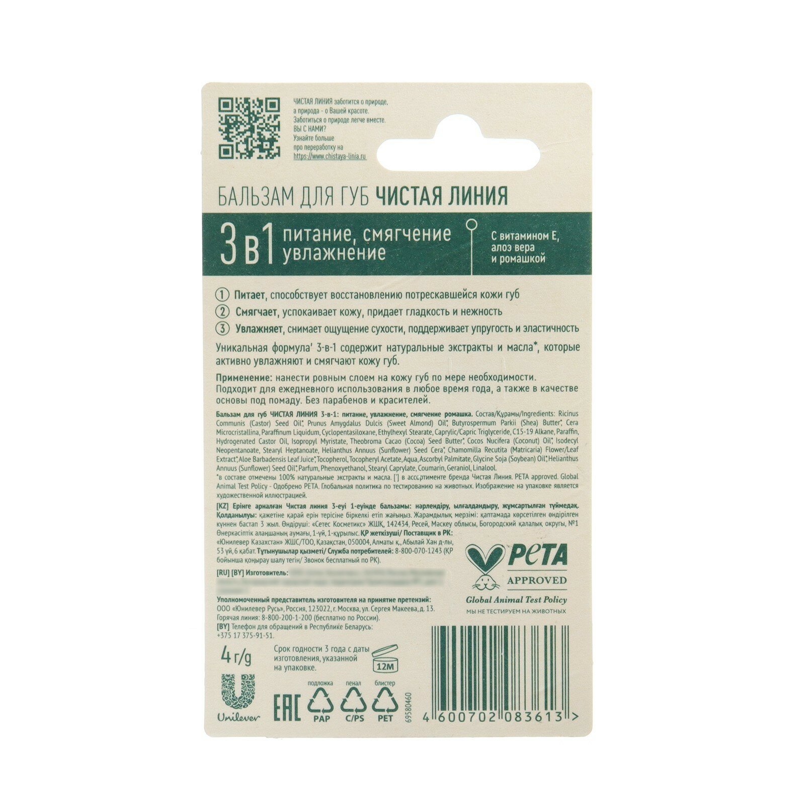 | Полное наименование | Бальзам для губ Чистая Линия 3в1 |