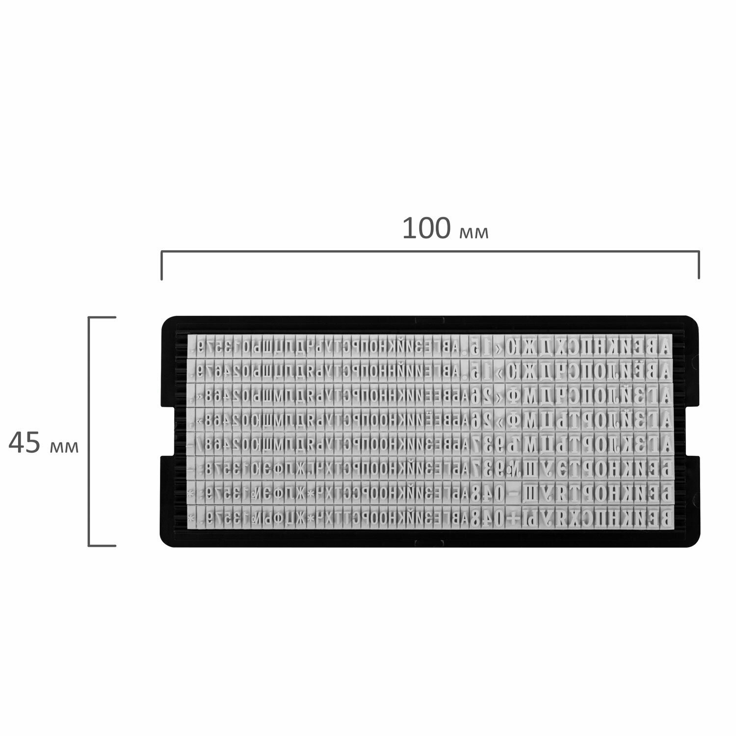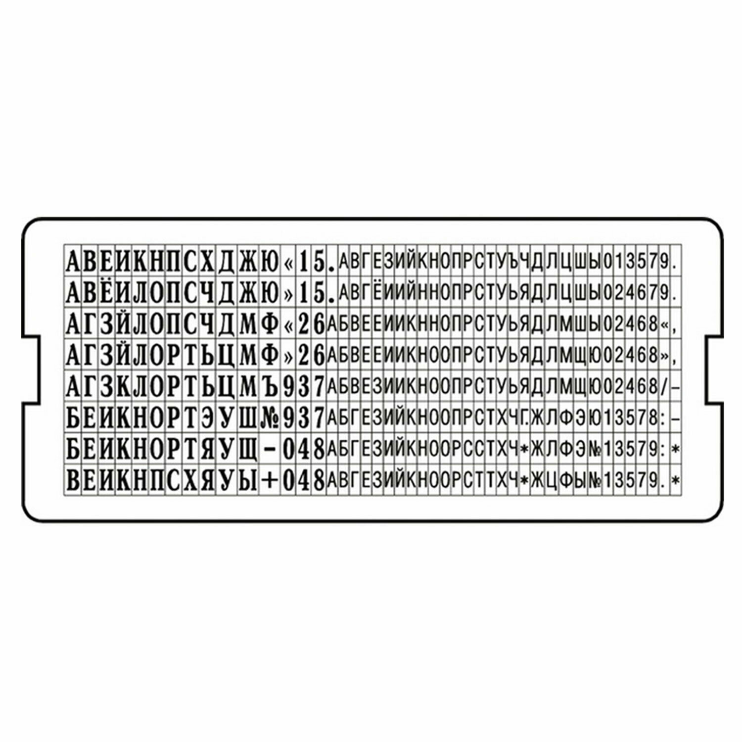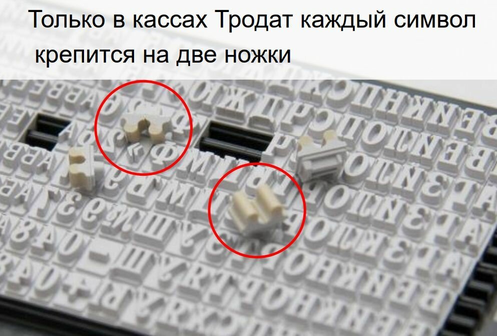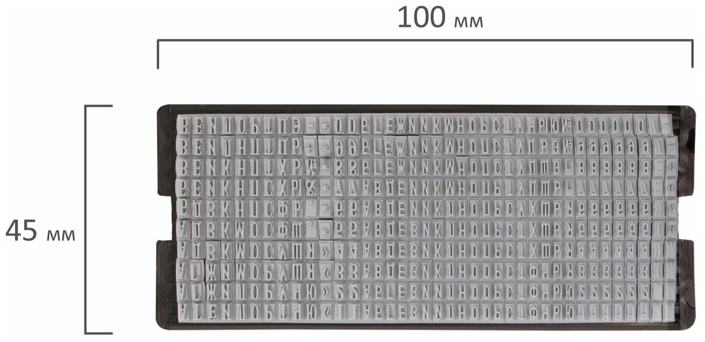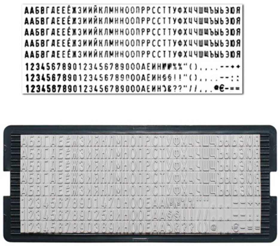Касса русских букв и цифр для самонаборных печатей, штампов, датеров "Тродат". В кассе 360 символов, высота строчных букв 3,1, высота прописных букв 2,2мм. Двухножечная система крепления.