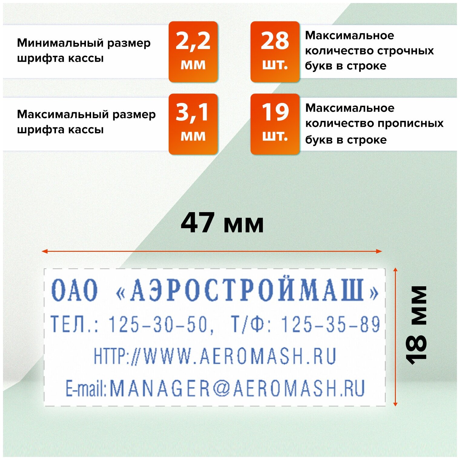 | Описание | Формат оттиска:прямоугольный. Высота цифр/шрифта:3.1/2.2 мм. Количество строчек оттиска |