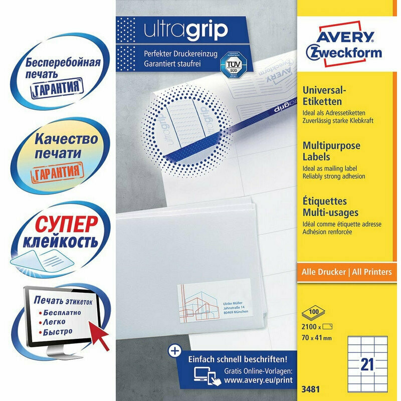Этикетки Avery Zweckform A4 70x41мм 21шт на листе/70г/м2/100л./белый матовое самоклей. универса 3481
