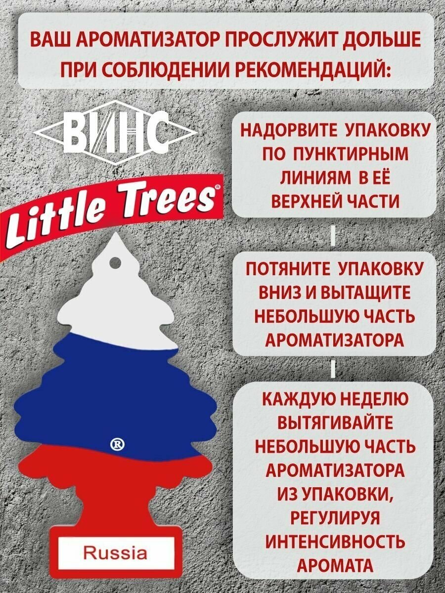 Освежитель воздуха Little Trees уникален по эффективности действия, насыщенности и стойкости запаха. Ароматизатор изготовлен из картона в форме ёлочки. Может использоваться как в автомобиле, так и в доме и офисе. Освежитель воздуха имеет индивидуальную яркую упаковку. Обладает различными приятными ароматами, имеет нитку для подвешивания.