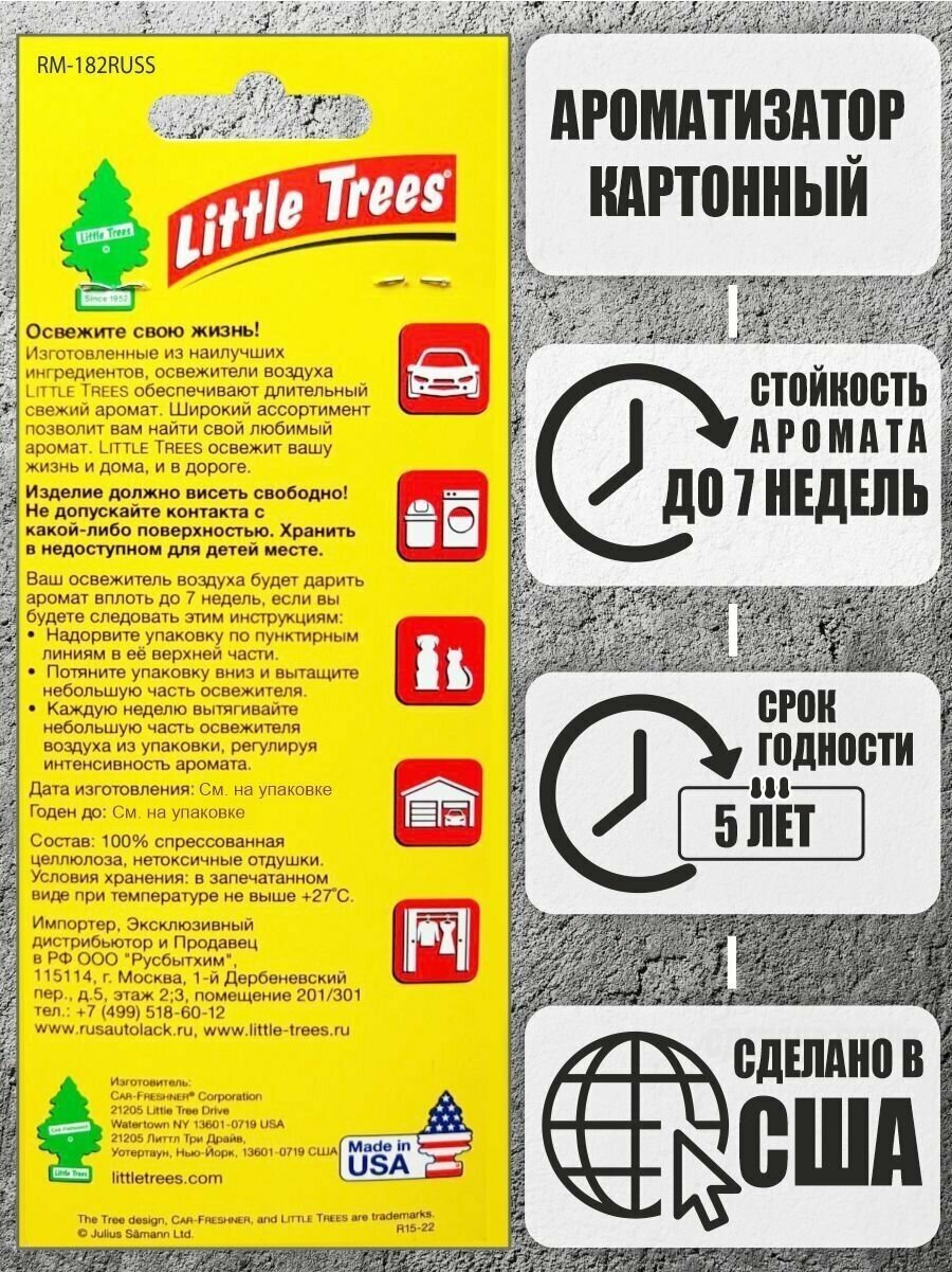Освежитель воздуха Little Trees уникален по эффективности действия, насыщенности и стойкости запаха. Ароматизатор изготовлен из картона в форме елочки. Обладает различными приятными ароматами, имеет нитку для подвешивания. Может использоваться как в автомобиле, так и в доме и офисе. Освежитель воздуха имеет индивидуальную яркую белую упаковку.