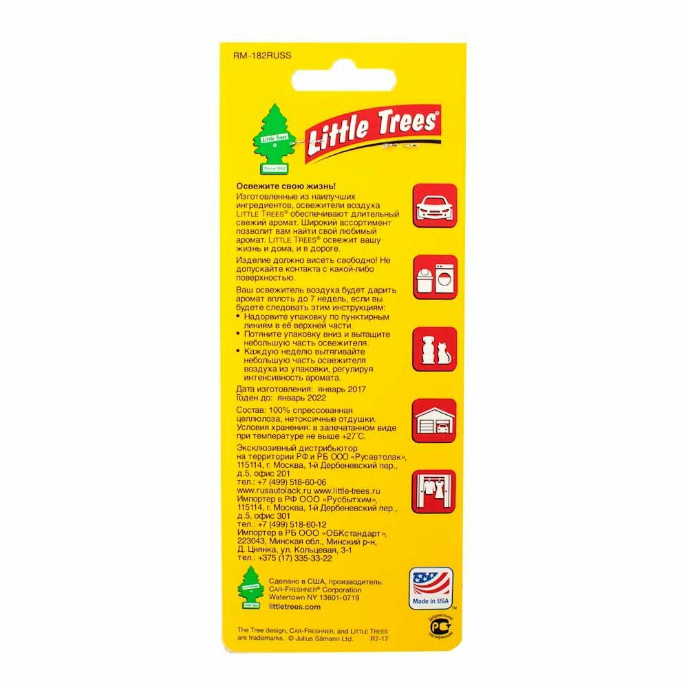 Освежитель воздуха Little Trees уникален по эффективности действия, насыщенности и стойкости запаха. Ароматизатор изготовлен из картона в форме ёлочки. Может использоваться как в автомобиле, так и в доме и офисе. Освежитель воздуха имеет индивидуальную яркую упаковку желтого цвета. Обладает различными приятными ароматами, имеет нитку для подвешивания.