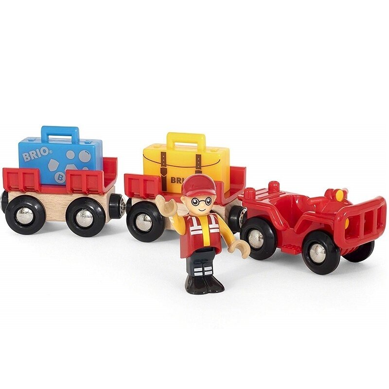 Для того чтобы сделать путешествие для БРИО-человечков более комфортным, на аэродромах и железнодорожных вокзалах BRIO есть автокары для перевозки багажа. Таким образом, пассажирам не придется нести свой багаж в руках – водитель поможет им погрузить чемоданы на прицепы автокара и доставит их прямо к дверям вагона поезда или к трапу самолёта. В этот набор входит автокар с двумя прицепами, водитель автокара и багаж пассажиров. Магнитные сцепки позволяют присоединять прицепы к кабине автокара. Автокар может ездить как по рельсам деревянной железной дороги БРИО, так и по любой ровной поверхности. С его помощью Ваш ребёнок сможет обеспечить комфорт всех пассажиров своего поезда или любого другого транспорта BRIO!